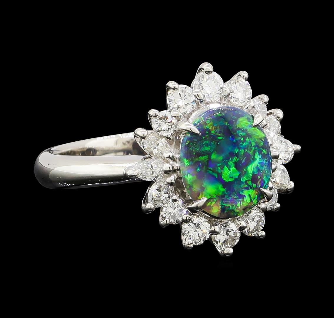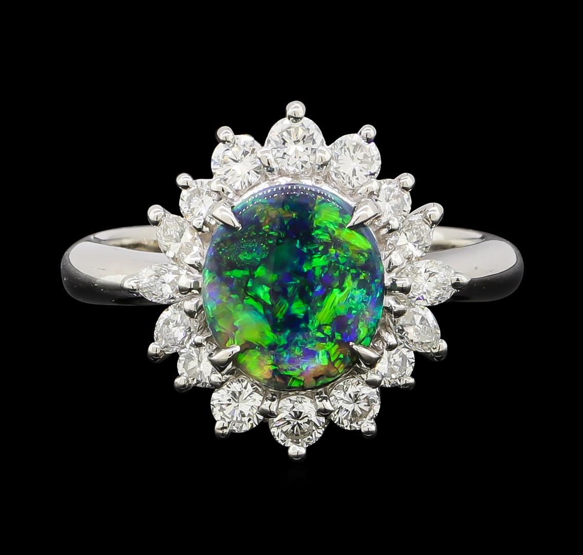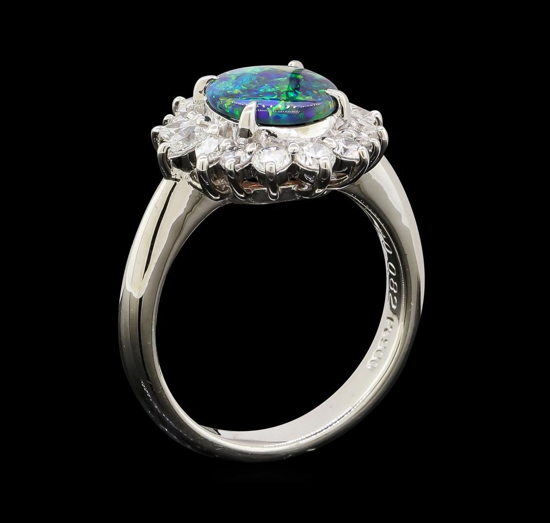 One ring featuring: Platinum containing Black Opal with a total weight of 0.82ct and Diamonds with a total weight of 0.74ct. Total Weight of Ring: 8 grams.