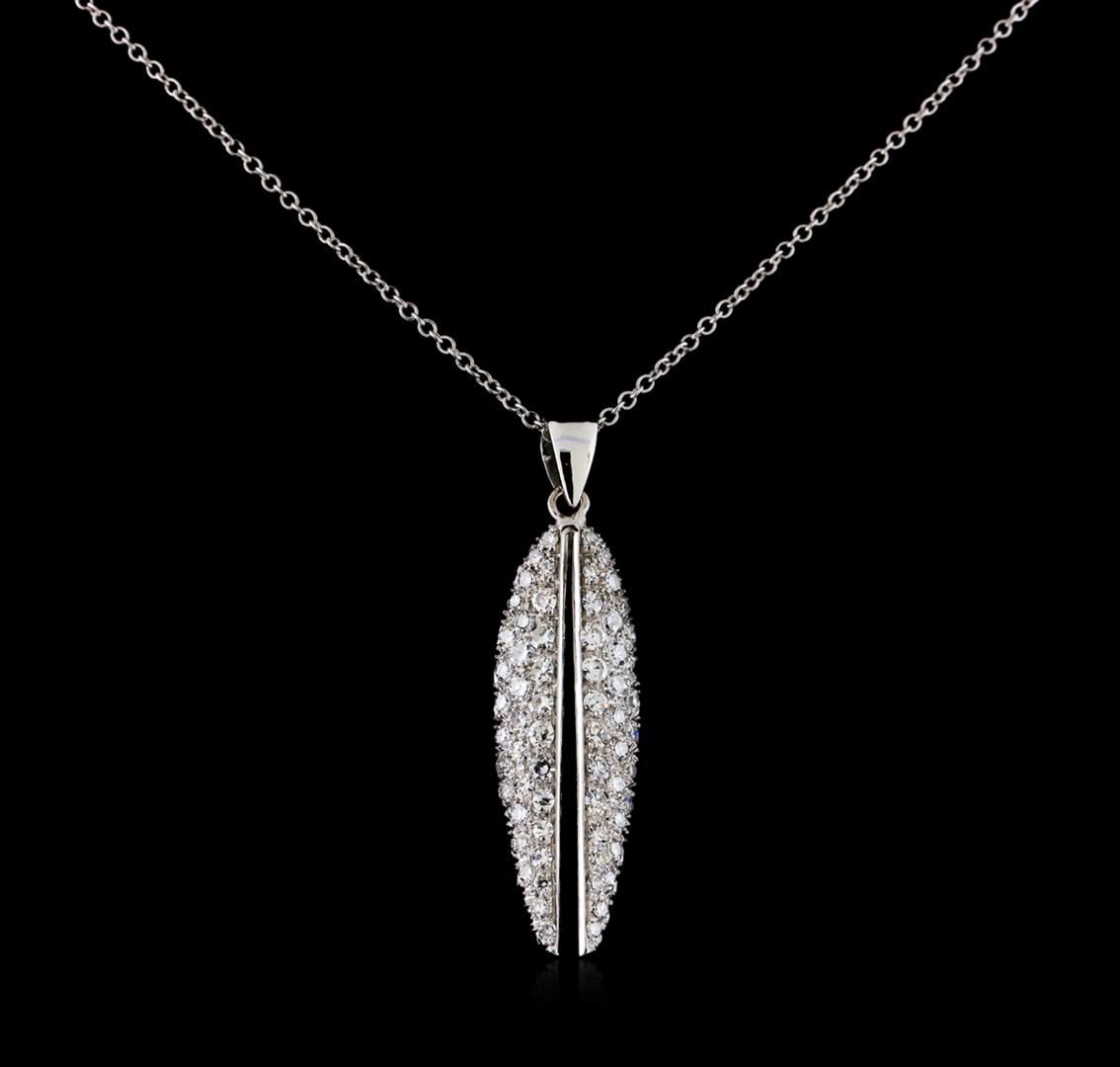 One electronically tested 14-18KT white gold ladies cast & assembled diamond pendant with chain. The pendant features a diamond set 18KT white gold leaf measuring one and one-half inches long completed by a 14KT white gold bail. The pendant is supported by an eighteen inch length 14KT white gold cable chain, terminating in a lobster claw clasp. Bright polish finish. Condition is new, good workmanship. Containing: Nineteen prong set single cut diamonds, measuring 1.80 - 1.70 x 1.05mm (depth est.) approximate total weight of 19 Stones = 0.40ct. Color & clarity grade are an average for the group. Graded in the setting. Clarity: VS-2 to SI-1. Color: F - H Forty-Five prong set single cut diamonds, measuring 1.50 - 1.20 x 0.81mm (depth est.) approximate total weight of 45 Stones = 0.42ct. Color & clarity grade are an average for the group. Graded in the setting. Clarity: VS-2 to SI-1. Color: F - H. Total Weight of Diamonds 0.82ct. Total Weight of Pendant With Chain 3.77gm. AIG Appraised at $2,845.00.