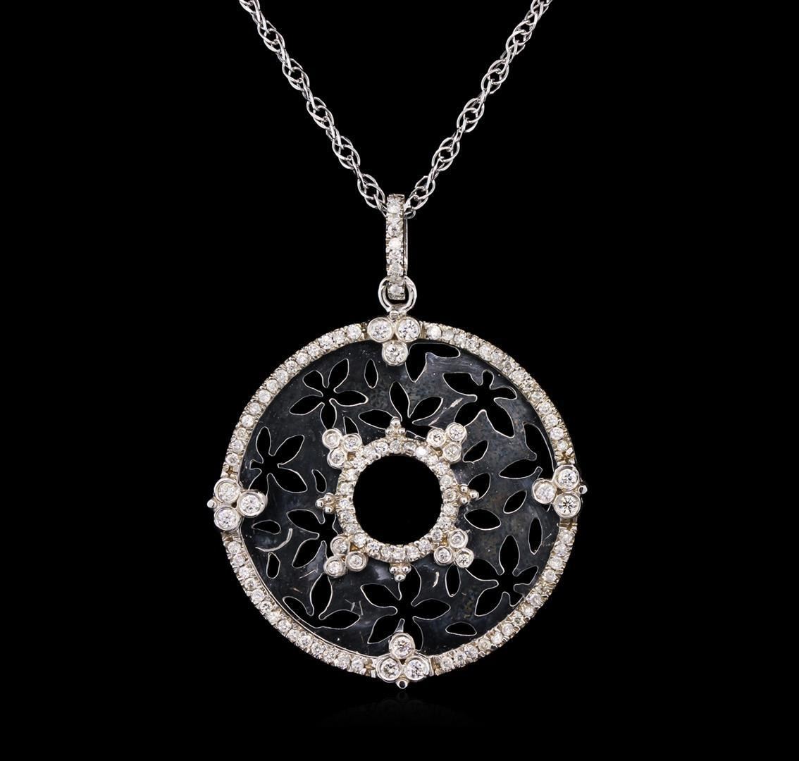 One electronically tested 14KT white gold ladies cast & assembled diamond pendant with chain. The thirty one millimeter round pendant disc features, floral cutouts framed by diamond ribbons supported by a diamond set bail, completed by an eighteen inch length one millimeter width designer style chain. Trademark is Fancy. Identified with markings of "14K ITALY". Condition is new, good workmanship. Containing: One Hundred One prong & bezel set round brilliant cut diamonds, measuring 1.10 - 1.20 x 0.69mm exact total weight 101 Stones = 0.56ct. Graded in the setting. Clarity: SI-2 to I-2. Color: G - I Twelve prong set round brilliant cut diamonds, measuring 1.80 - 1.80 x 1.08mm exact total weight 12 Stones = 0.26ct. Graded in the setting. Clarity: SI-2 to I-2. Color: G - I. Total Weight of Diamonds 0.82ct. Total Weight of Pendant With Chain 9.94gm. AIG Appraised.