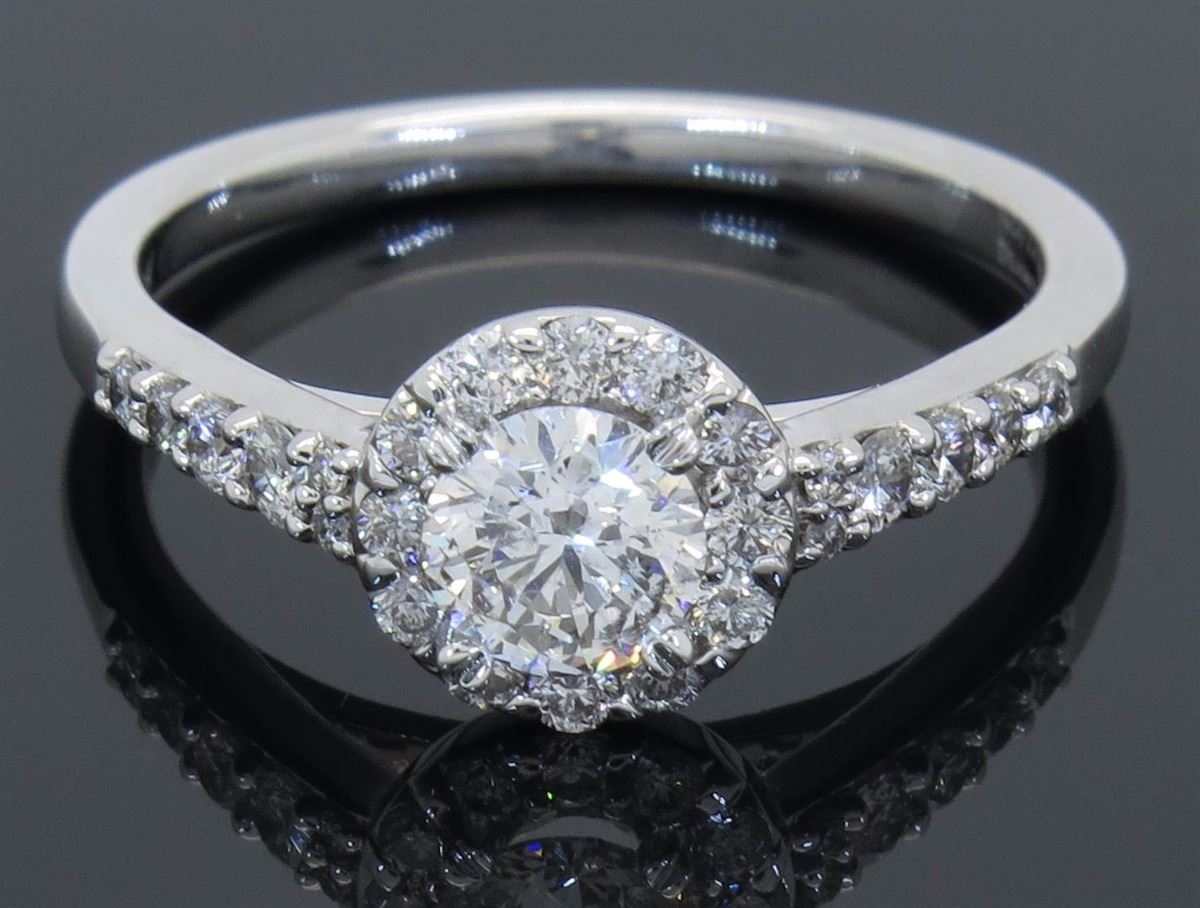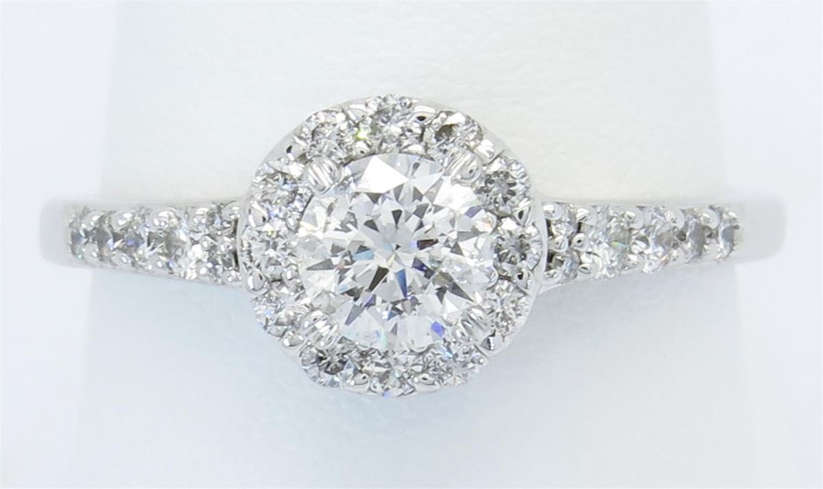 One tested 14K white gold diamond ring. Condition is new. Containing: One Round Noventa Cut Diamond. Approximate weight: .42CT, Clarity: I1, Color: F-G. 24 Round Brilliant Cut Diamonds. Approximate total diamond weight: .82CTW. Diamonds are graded in the mounting, unless otherwise stated. Weight of ring: 3.4 grams. Size: 6.75