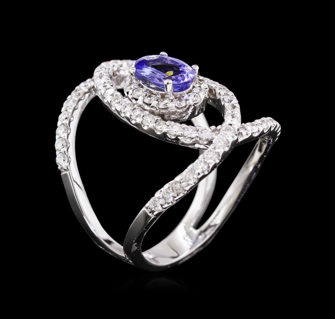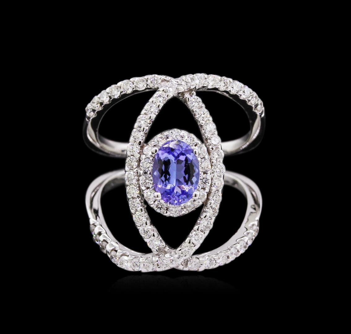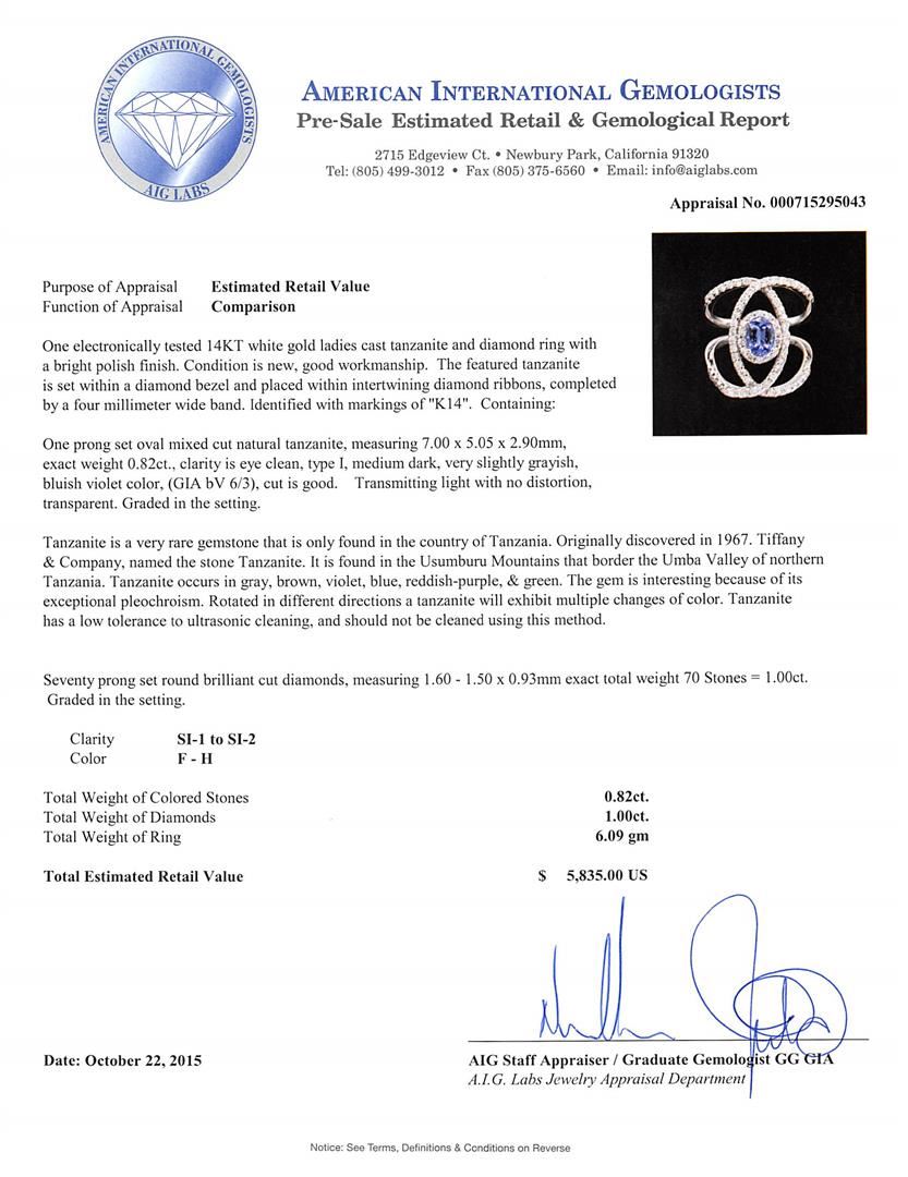 One electronically tested 14KT white gold ladies cast tanzanite and diamond ring with a bright polish finish. The featured tanzanite is set within a diamond bezel and placed within intertwining diamond ribbons, completed by a four millimeter wide band. Identified with markings of "K14". Condition is new, good workmanship. Containing: One prong set oval mixed cut natural tanzanite, measuring 7.00 x 5.05 x 2.90mm, exact weight 0.82ct., clarity is eye clean, type I, medium dark, very slightly grayish, bluish violet color, (GIA bV 6/3), cut is good. Transmitting light with no distortion, transparent. Graded in the setting. Tanzanite is a very rare gemstone that is only found in the country of Tanzania. Originally discovered in 1967. Tiffany & Company, named the stone Tanzanite. It is found in the Usumburu Mountains that border the Umba Valley of northern Tanzania. Tanzanite occurs in gray, brown, violet, blue, reddish-purple, & green. The gem is interesting because of its exceptional pleochroism. Rotated in different directions a tanzanite will exhibit multiple changes of color. Tanzanite has a low tolerance to ultrasonic cleaning, and should not be cleaned using this method. Seventy prong set round brilliant cut diamonds, measuring 1.60 - 1.50 x 0.93mm exact total weight 70 Stones = 1.00ct. Graded in the setting. Clarity: SI-1 to SI-2. Color: F - H. Total Weight of Colored Stones 0.82ct. Total Weight of Diamonds 1.00ct. Total Weight of Ring 6.09gm. AIG Appraised at $5,835.00.