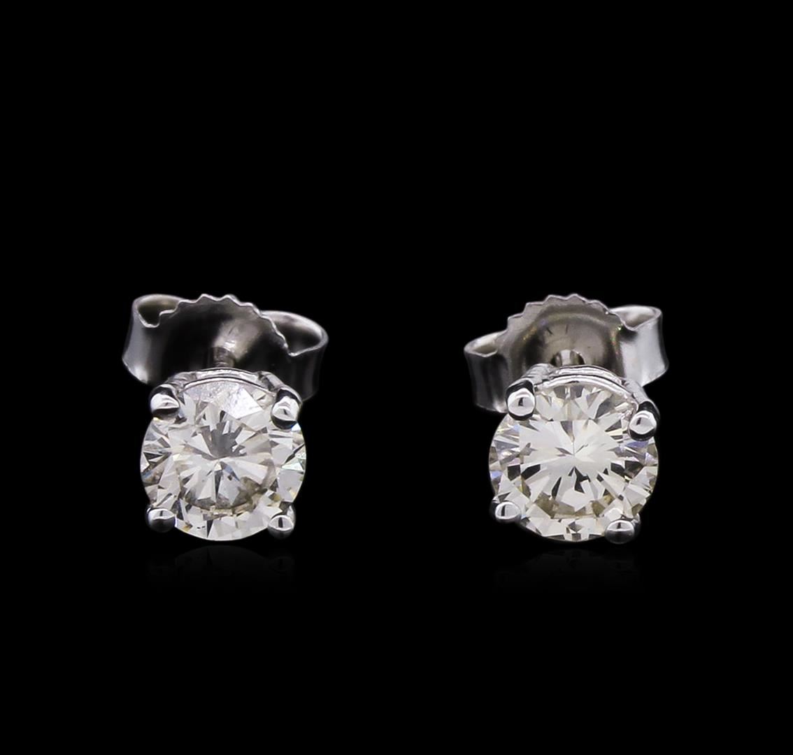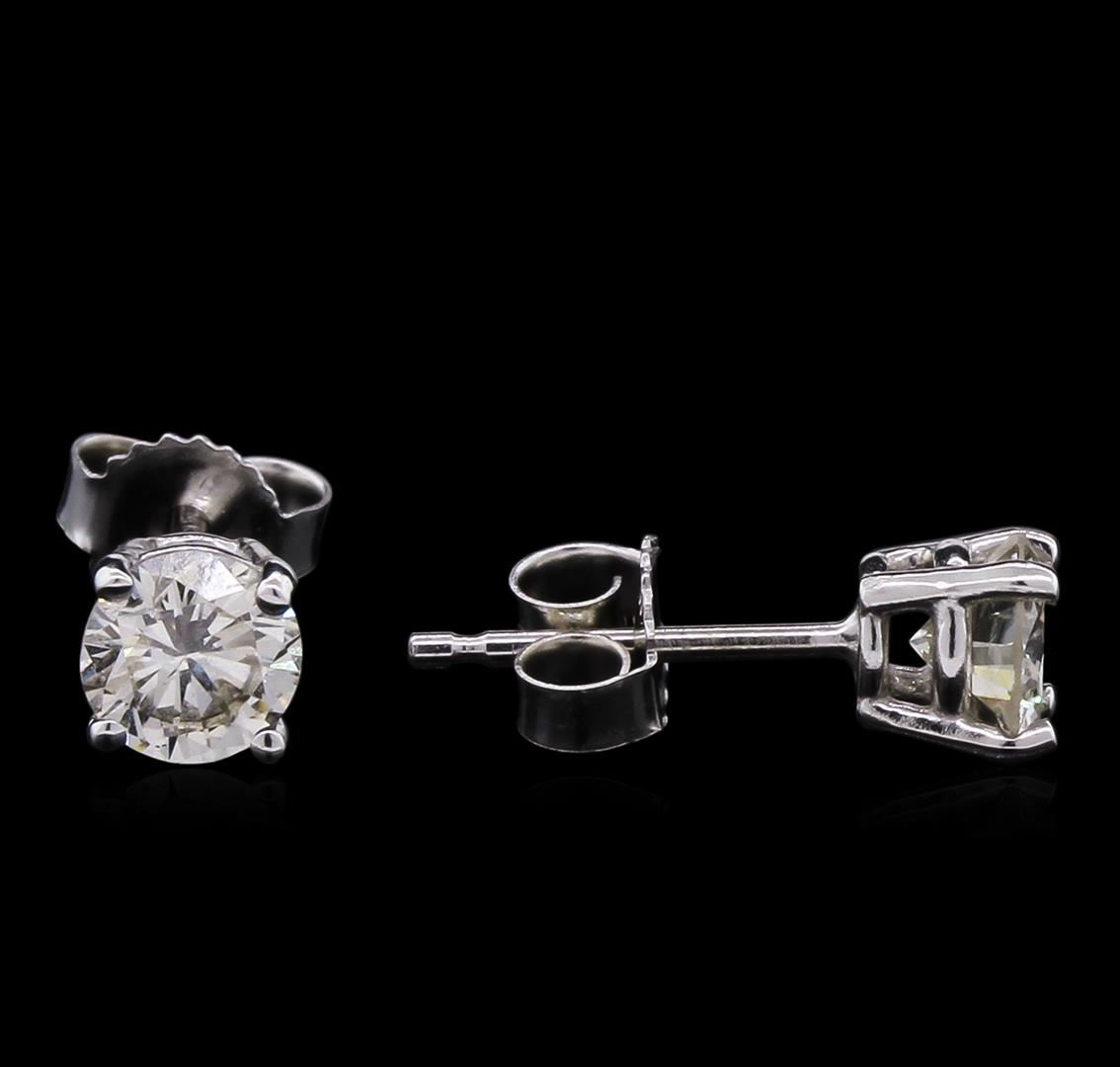 One electronically tested 14KT white gold cast & assembled diamond solitaire earrings with standard backs. Bright polish finish. Identified with markings of "14 KARAT". Condition is good. Containing: One prong set round brilliant cut diamond, measuring 4.53 - 4.50 x 3.00mm (depth est.) approximate weight of 0.40ct with a medium strong blue fluorescence. Faint brown secondary color throughout. Graded in the setting. Clarity: SI-1. Color: J. Depth 66.4%. Table 64.2%. One prong set round brilliant cut diamond, measuring 4.58 - 4.55 x 3.00mm (depth est.) approximate weight of 0.42ct with a medium strong blue fluorescence. Faint brown secondary color throughout. Graded in the setting. Clarity: SI-1. Color: K. Depth 65.7%. Table 67.8%. Total Weight of Diamonds 0.82ct. Total Weight of Earrings 0.88gm. AIG Appraised at $3,400.00.