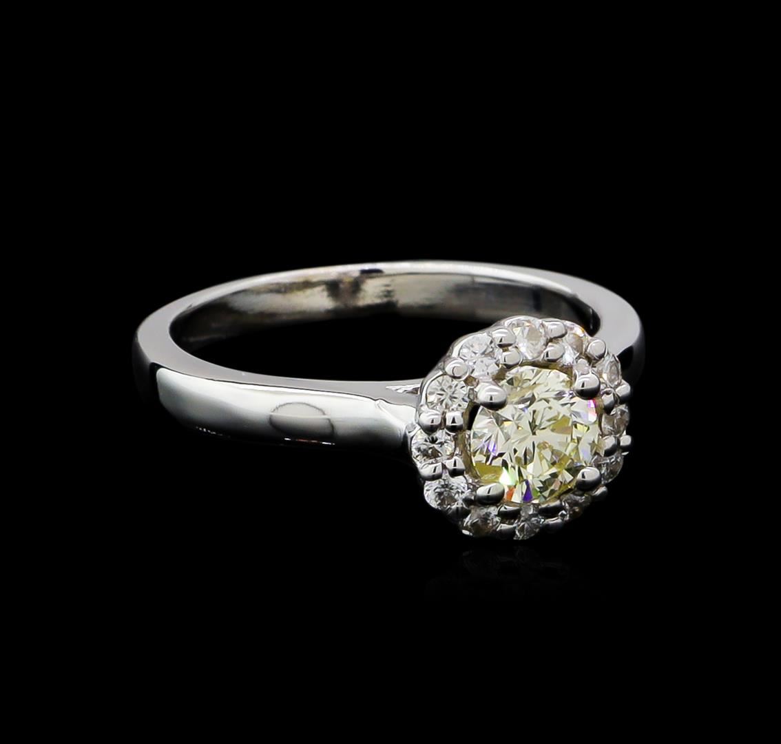 One electronically tested 14KT white gold ladies cast diamond unity ring with a bright polish finish. The featured diamond is set within a diamond bezel, completed by a two millimeter wide band. Identified with markings of "14K". Condition is new, good workmanship. Containing: One prong set round brilliant cut diamond, measuring 5.40 - 5.35 x 3.35mm (depth est.) approximate weight of 0.60ct. Graded in the setting. Clarity: I-1. Depth: 62.3%. Table 52.0%. Twelve prong set round brilliant cut diamonds approximate total weight of 12 Stones = 0.22ct. Graded in the setting. Clarity: SI-2 to I-1. Color: G - I. Total Weight of Diamonds 0.82ct. Total Weight of Ring 3.83gm. AIG Appraised at $2,990.00.