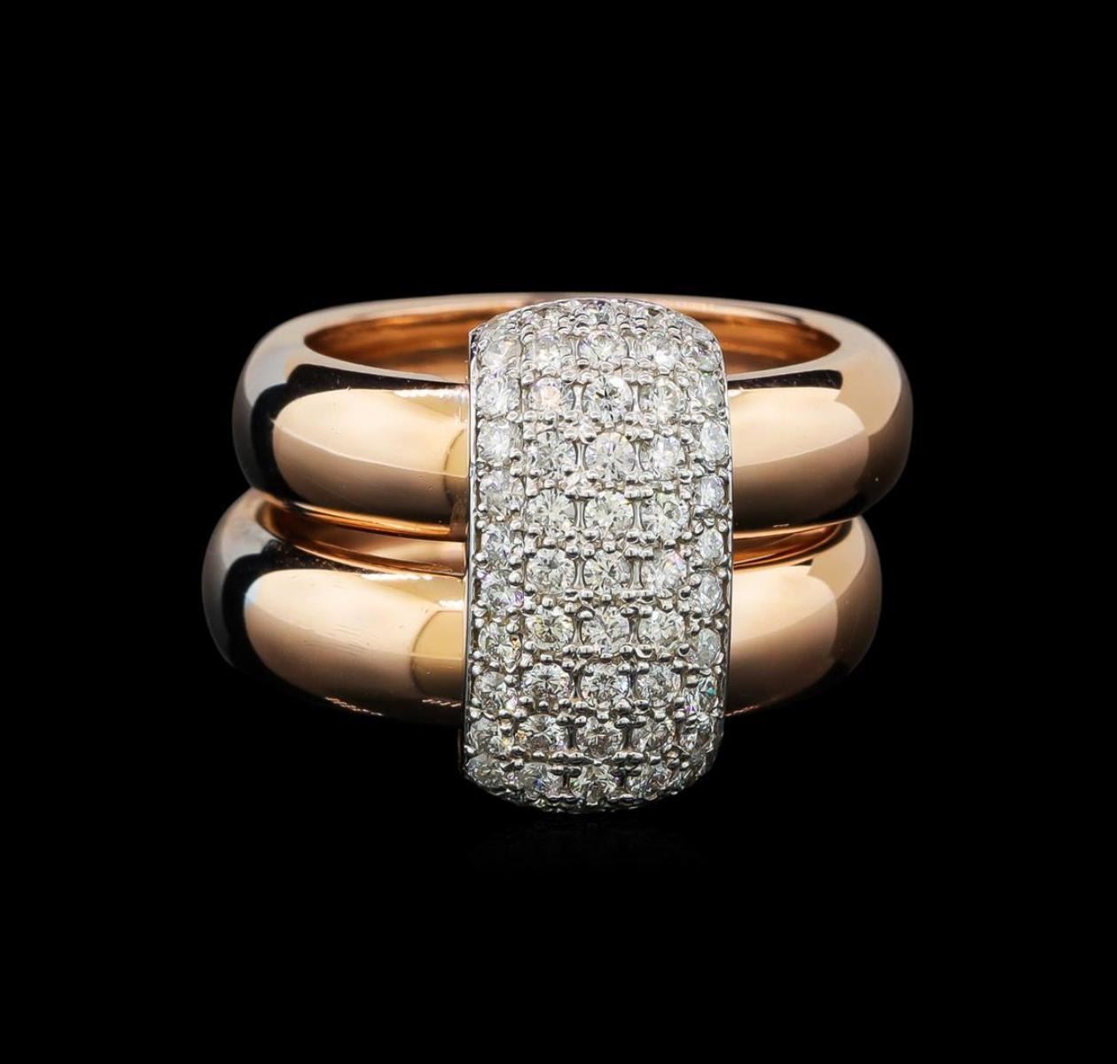 One electronically tested 14KT rose and white gold lady's combination cast & assembled fashion ring with a double shank with a bright polish finish. The featured lady's ring has a diamond encrusted vertical ribbon motif and a double shank measuring 10.07 millimeters wide. Identified with markings of 'K14'. Condition is new, good workmanship. Containing: Sixty prong set round brilliant cut diamonds, measuring 1.60 - 1.50 x 0.95mm (depth est.) approximate total weight of 60 Stones = 0.83ct. Graded in the setting. Clarity SI-1 to I-1. Color: G - I Cut Good. Total Weight of Diamonds 0.83ct.. Total Weight of Ring 9.80gm. GAS Appraised.