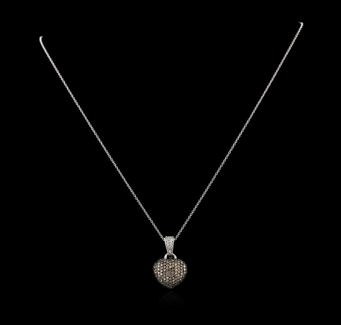 One electronically tested 14KT white gold ladies cast & assembled diamond pendant with chain. The heart shaped pendant features a convex diamond gallery supported by an elaborate lattice under gallery, completed by a diamond set hinge snap locking bail. The pendant is supported by a sixteen inch length 14KT white gold cable chain, terminating in a spring ring clasp. Bright and anodized finish. Trademark is BH. Identified with markings of "14K". Condition is new, good workmanship. Containing: One Hundred Fifteen prong set round brilliant cut diamonds, measuring 1.30 - 1.15 x 0.74mm (depth est.) approximate total weight of 115 Stones = 0.77ct. Color grade is an average for the group. Graded in the setting. Clarity: SI-2 to I-1 Seventeen prong set single cut diamonds, measuring 1.00 - 1.00 x 0.60mm (depth est.) approximate total weight of 17 Stones = 0.06ct. Graded in the setting. Clarity: SI-1 to I-1. Color: F - H. Total Weight of Diamonds 0.83ct. Total Weight of Pendant With Chain 5.20gm. AIG Appraised at $3,190.00.