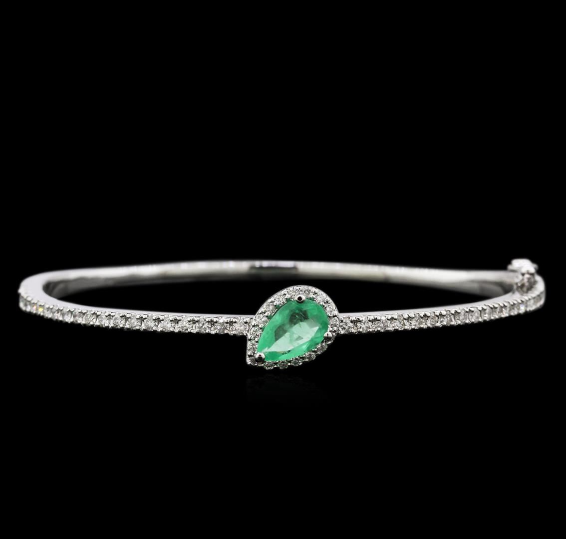 One electronically tested 14KT white gold lady's combination cast & assembled fashion bangle bracelet with a concealed clasp with foldover safety with a bright polish finish. The featured lady's bangle bracelet measures approximately 6.75 inches in length. Identified with markings of "K14". Condition is new, good workmanship. Containing: One prong set pear modified brilliant cut natural emerald, measuring 8.90 x 5.74 x 3.01mm, approximate weight of 0.83ct., clarity is moderately included, type III, medium light, very slightly grayish, green color, (GIA G 4/3), cut is good. Transmitting light somewhat diffusely, transparent to translucent. Indications of oil residue. Graded in the setting. Thirty-Nine prong set round brilliant cut diamonds, measuring 1.80 - 1.75 x 1.10mm (depth est.) approximate total weight of 39 Stones = 0.83ct. Graded in the setting. Clarity: SI-1 to I-1. Color: G - I. Cut Good Seventeen prong set round brilliant cut diamonds, measuring 1.45 - 1.40 x 0.86mm (depth est.) approximate total weight of 17 Stones = 0.18ct. Graded in the setting. Clarity: SI-1 to I-1. Color: G - I. Cut Good. Total Weight of Colored Stones 0.83ct. Total Weight of Diamonds 1.01ct. Total Weight of Bangle Bracelet 12.10gm. GAS Appraised at $4,700.00.