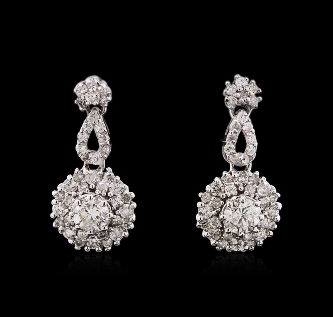 One pair of earrings featuring: 14KT white gold weighing 3.01 grams containing one diamond with a total weight of 0.50ct and side diamonds with a total weight of 0.34ct.