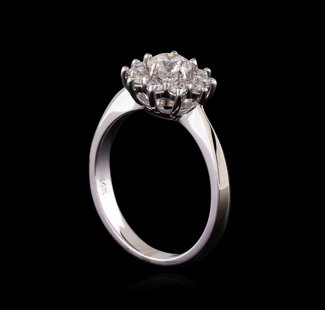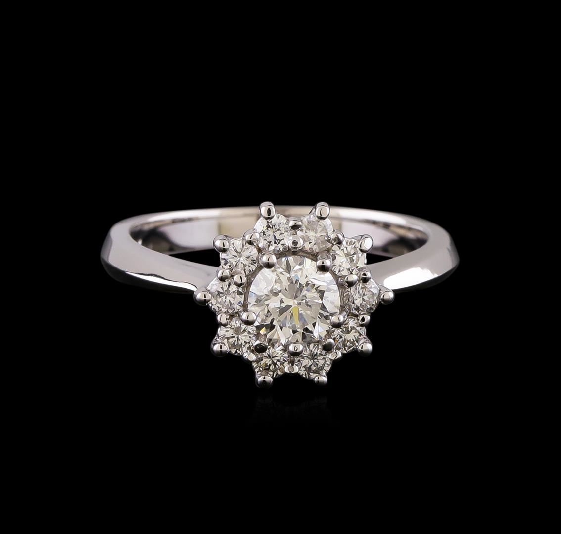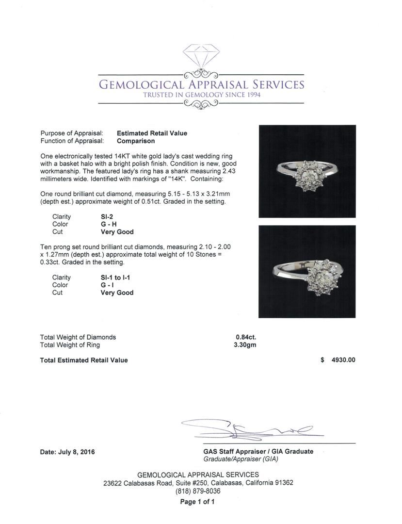 One electronically tested 14KT white gold lady's cast wedding ring with a basket halo with a bright polish finish. The featured lady's ring has a shank measuring 2.43 millimeters wide. Identified with markings of "14K". Condition is new, good workmanship. Containing: One round brilliant cut diamond, measuring 5.15 - 5.13 x 3.21mm (depth est.) approximate weight of 0.51ct. Graded in the setting. Clarity: SI-2. Color: G - Very Good Ten prong set round brilliant cut diamonds, measuring 2.10 - 2.00 x 1.27mm (depth est.) approximate total weight of 10 Stones = 0.33ct. Graded in the setting. Clarity: SI-1 to I-1. Color: G - I. Cut Very Good. Total Weight of Diamonds 0.84ct. Total Weight of Ring 3.30gm. GAS Appraised at $4,930.00.