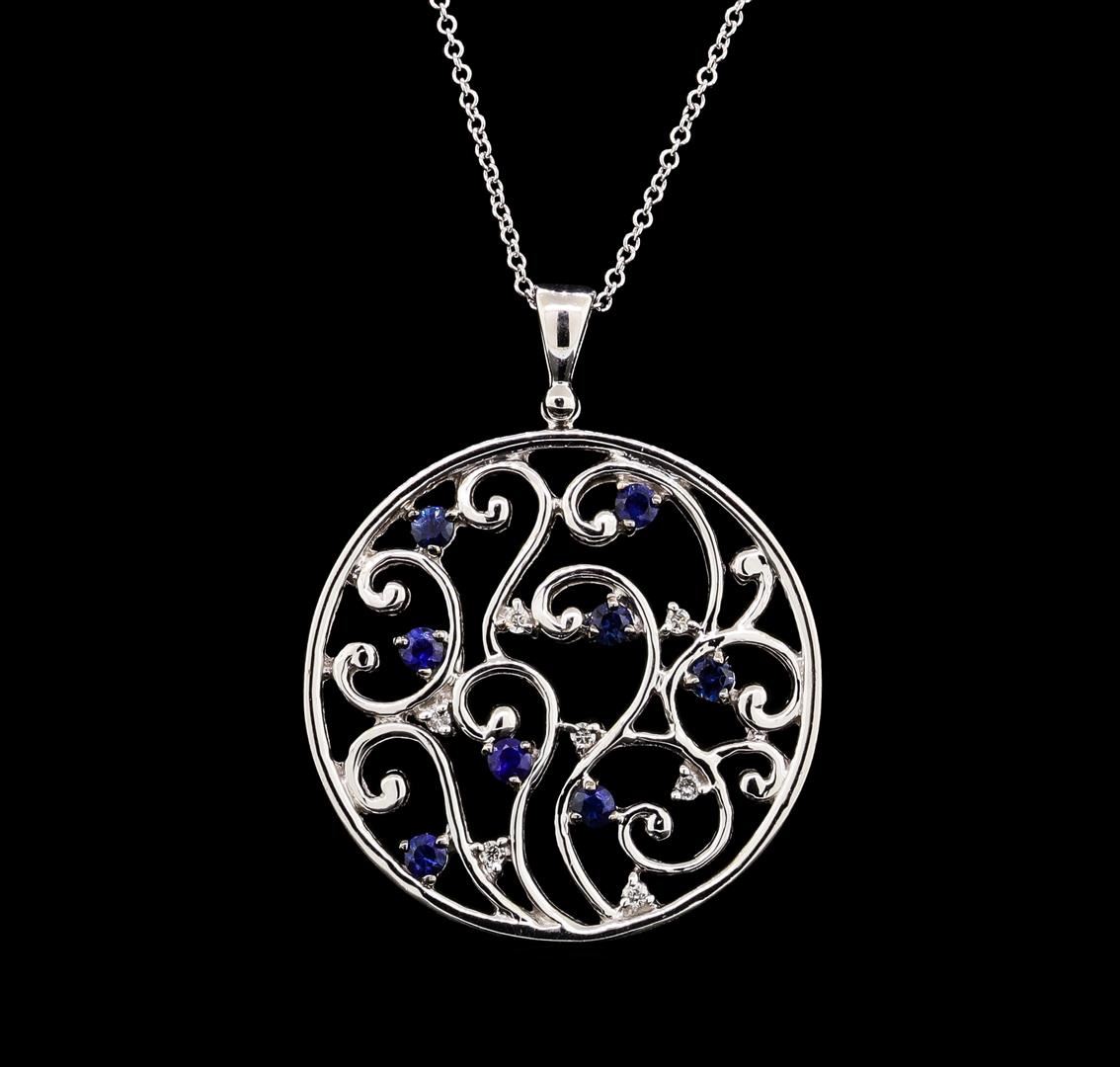 One electronically tested 14KT white gold lady's combination cast & assembled fashion pendant & chain 18.0' long, 1.1mm round cable link with a spring ring clasp with a bright polish finish. The featured pendant has a round motif with internal scroll designs. Trademark is Effy. Identified with markings of '14K'. Condition is new, good workmanship. Containing: Eight prong set round modified mixed cut natural blue sapphires, measuring 2.70 - 2.60 x 1.72 mm, (depth est.) approximate total weight of 0.84ct., clarity is eye clean, medium dark, moderately strong, blue color, (GIA B 6/4), cut is very good. Transmitting light with no distortion, transparent. Colored gemstones are presumed to have been subjected to commonly used enhancement processes. Graded in the setting. Seven prong set round brilliant cut diamonds, measuring 1.60 - 1.50 x 0.96mm (depth est.) approximate total weight of 7 Stones = 0.10ct. Graded in the setting. Color H - I Clarity SI-2 to I-1 Cut Good. Total Weight of Colored Stones 0.84ct.. Total Weight of Diamonds 0.10ct.. Total Weight of Pendant & Chain 9.50gm GAS Appraised at $2650.00. GAS Appraised at $2,650.00.