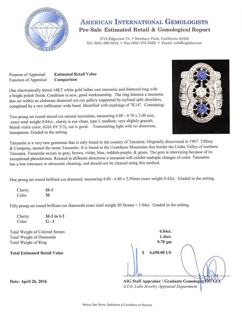 One electronically tested 14KT white gold ladies cast tanzanite and diamond ring with a bright polish finish. The ring features a tanzanite duo set within an elaborate diamond cut-out gallery supported by stylized split shoulders, completed by a two millimeter wide band. Identified with markings of "K14". Condition is new, good workmanship. Containing: Two prong set round mixed cut natural tanzanites, measuring 4.80 - 4.70 x 3.09 mm, exact total weight 0.84ct., clarity is eye clean, type I, medium, very slightly grayish, bluish violet color, (GIA bV 5/3), cut is good. Transmitting light with no distortion, transparent. Graded in the setting. Tanzanite is a very rare gemstone that is only found in the country of Tanzania. Originally discovered in 1967. Tiffany & Company, named the stone Tanzanite. It is found in the Usumburu Mountains that border the Umba Valley of northern Tanzania. Tanzanite occurs in gray, brown, violet, blue, reddish-purple, & green. The gem is interesting because of its exceptional pleochroism. Rotated in different directions a tanzanite will exhibit multiple changes of color. Tanzanite has a low tolerance to ultrasonic cleaning, and should not be cleaned using this method. One prong set round brilliant cut diamond, measuring 4.80 - 4.80 x 2.88mm exact weight 0.42ct. Graded in the setting. Clarity: SI-1. Color: M Fifty prong set round brilliant cut diamonds exact total weight 50 Stones = 1.04ct. Graded in the setting. Clarity: SI-2 to I-2. Color: G - I. Total Weight of Colored Stones 0.84ct. Total Weight of Diamonds 1.46ct. Total Weight of Ring 9.78gm. AIG Appraised at $6,650.00.