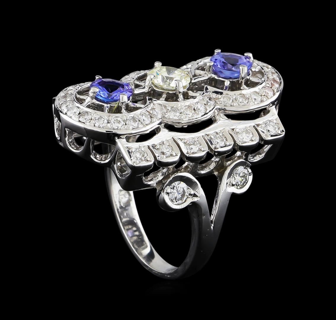 One electronically tested 14KT white gold ladies cast tanzanite and diamond ring with a bright polish finish. The ring features a tanzanite duo set within an elaborate diamond cut-out gallery supported by stylized split shoulders, completed by a two millimeter wide band. Identified with markings of "K14". Condition is new, good workmanship. Containing: Two prong set round mixed cut natural tanzanites, measuring 4.80 - 4.70 x 3.09 mm, exact total weight 0.84ct., clarity is eye clean, type I, medium, very slightly grayish, bluish violet color, (GIA bV 5/3), cut is good. Transmitting light with no distortion, transparent. Graded in the setting. Tanzanite is a very rare gemstone that is only found in the country of Tanzania. Originally discovered in 1967. Tiffany & Company, named the stone Tanzanite. It is found in the Usumburu Mountains that border the Umba Valley of northern Tanzania. Tanzanite occurs in gray, brown, violet, blue, reddish-purple, & green. The gem is interesting because of its exceptional pleochroism. Rotated in different directions a tanzanite will exhibit multiple changes of color. Tanzanite has a low tolerance to ultrasonic cleaning, and should not be cleaned using this method. One prong set round brilliant cut diamond, measuring 4.80 - 4.80 x 2.88mm exact weight 0.42ct. Graded in the setting. Clarity: SI-1. Color: M Fifty prong set round brilliant cut diamonds exact total weight 50 Stones = 1.04ct. Graded in the setting. Clarity: SI-2 to I-2. Color: G - I. Total Weight of Colored Stones 0.84ct. Total Weight of Diamonds 1.46ct. Total Weight of Ring 9.78gm. AIG Appraised at $6,650.00.