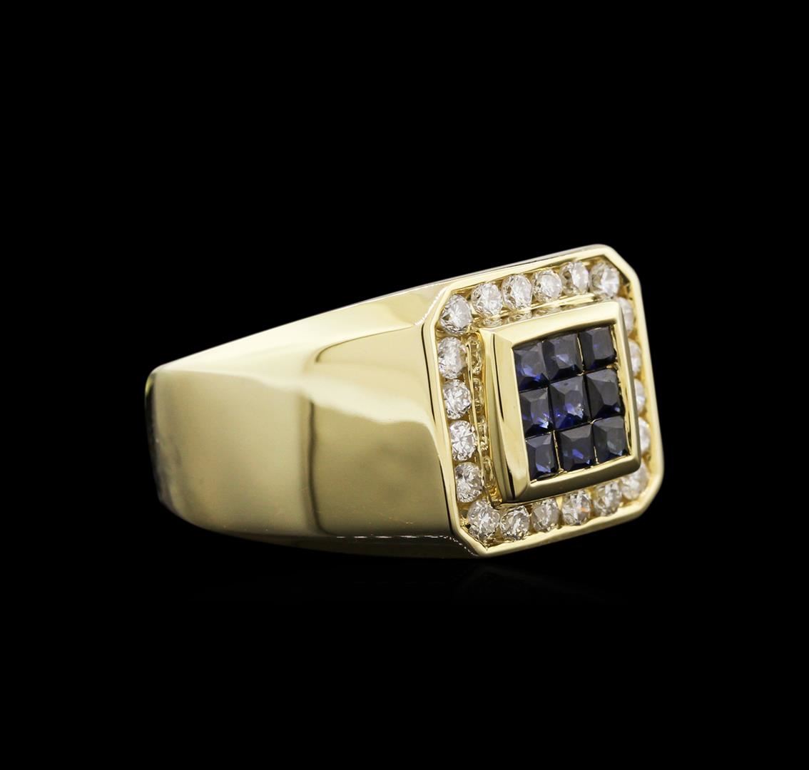 One electronically tested 14KT yellow gold man's cast fashion ring with a tapered shank with a bright polish finish. Condition is new. Identified with markings of "14K'. Containing: Nine invisible set princess modified brilliant cut natural blue sapphires, measuring 2.50 x 2.40 x 1.56mm, approximate total weight of 0.84ct., clarity is slightly included, type II, medium, very slightly grayish, bluish violet color, (GIA bV 5/3), cut is good. Colored gemstones are presumed to have been subjected to commonly used enhancement processes. Naturally occurring internal and external characteristics are present. Graded in the setting. Twenty channel set round brilliant cut diamonds, measuring 2.20 - 2.10 x 1.29mm (depth est.) approximate total weight of 20 Stones = 0.68ct. Graded in the setting. Clarity: SI-1 to I-1. Color: H - J. Cut: Good. Total Weight of Colored Stones: 0.84ct. Total Weight of Diamonds: 0.68ct. Total Weight of Ring: 10.30 gm. GAS Appraised at $5,390.00.