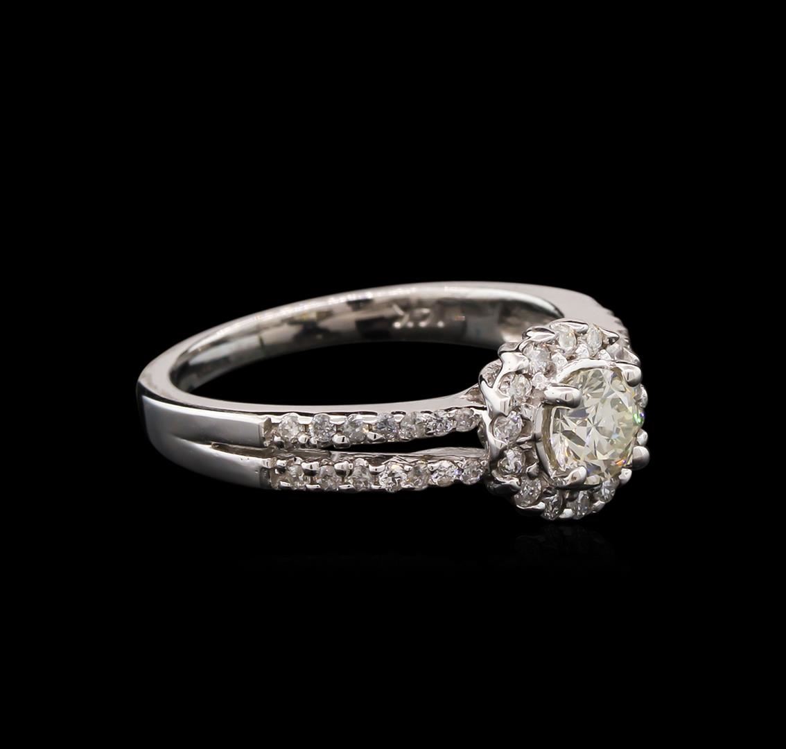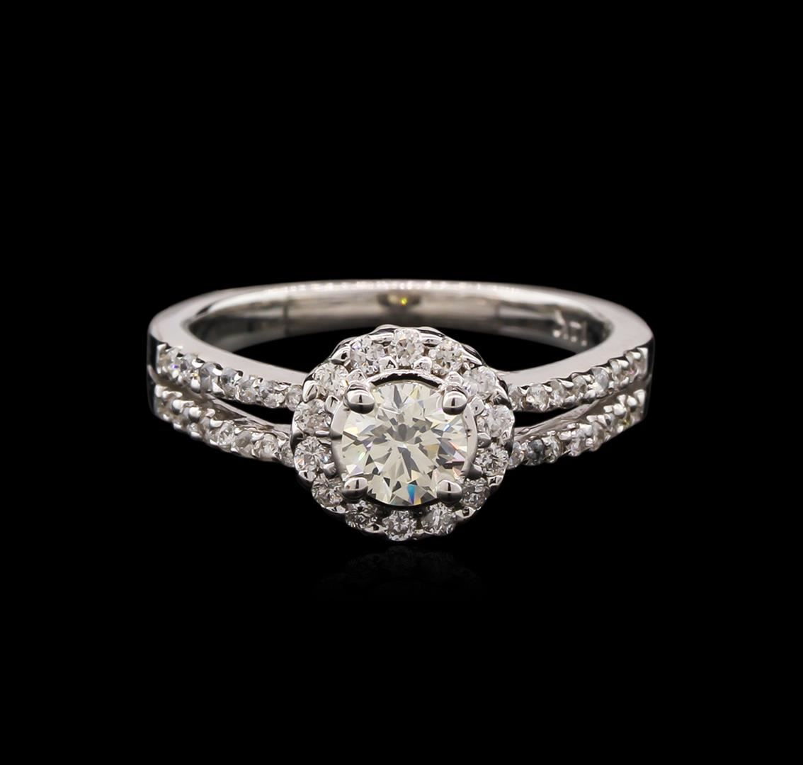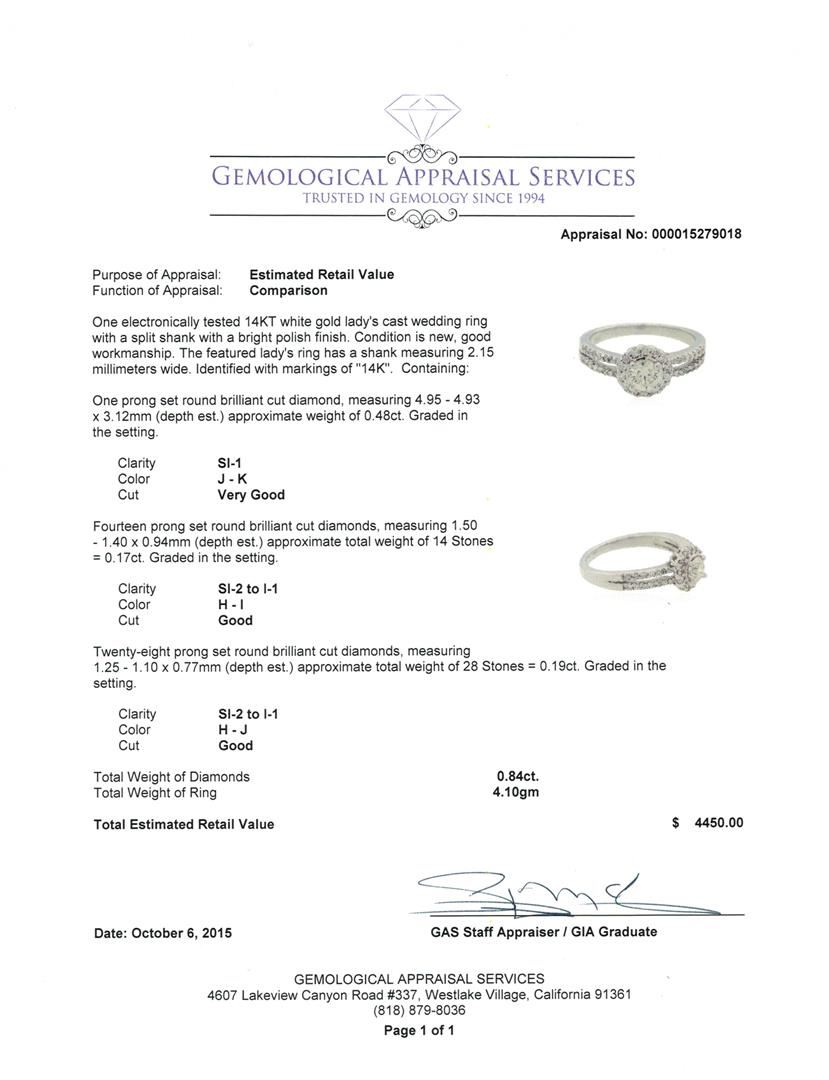 One electronically tested 14KT white gold lady's cast wedding ring with a split shank with a bright polish finish. The featured lady's ring has a shank measuring 2.15 millimeters wide. Identified with markings of "14K". Condition is new, good workmanship. Containing: One prong set round brilliant cut diamond, measuring 4.95 - 4.93 x 3.12mm (depth est.) approximate weight of 0.48ct. Graded in the setting. Clarity: SI-1. Color: J - Very Good Fourteen prong set round brilliant cut diamonds, measuring 1.50 - 1.40 x 0.94mm (depth est.) approximate total weight of 14 Stones = 0.17ct. Graded in the setting. Clarity: SI-2 to I-1. Color: H - I. Cut Good Twenty-Eight prong set round brilliant cut diamonds, measuring 1.25 - 1.10 x 0.77mm (depth est.) approximate total weight of 28 Stones = 0.19ct. Graded in the setting. Clarity: SI-2 to I-1. Color: H - Good. Total Weight of Diamonds 0.84ct. Total Weight of Ring 4.10gm. GAS Appraised at $4,450.00.