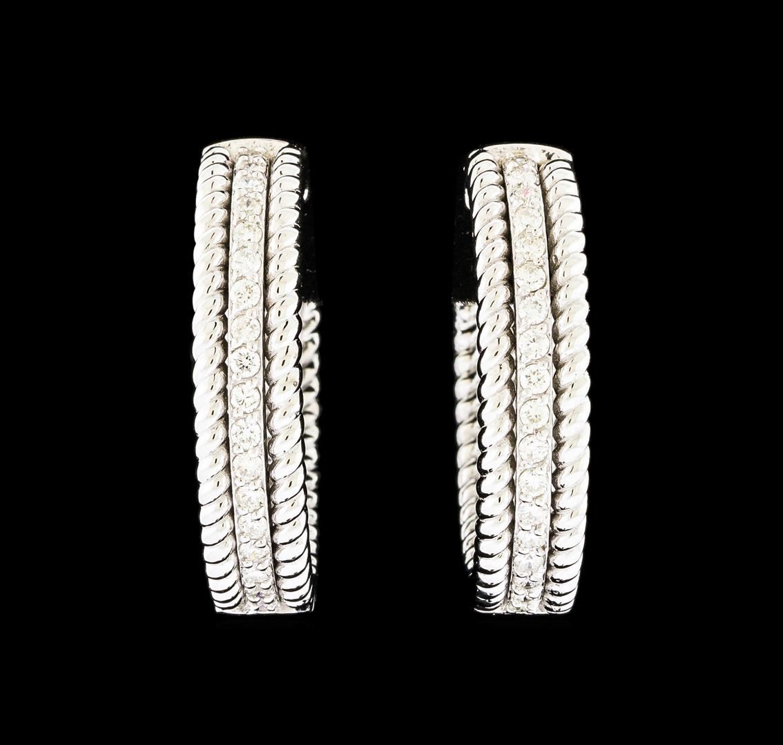 One pair electronically tested 14KT white gold lady's combination cast & assembled inside out hoop earrings with hinged clip backs with a bright polish finish. Identified with markings of 'K14'. Condition is new, good workmanship. Containing: Fifty-Eight prong set round brilliant cut diamonds, measuring 1.60 - 1.55 x 0.98mm (depth est.) approximate total weight of 58 Stones = 0.85ct. Graded in the setting. Clarity SI-1 to SI-2. Color: G - H Cut Good. Total Weight of Diamonds 0.85ct.. Total Weight of Earrings 14.00gm. GAS Appraised at $4,835.00.