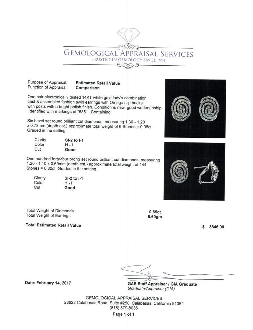 One pair electronically tested 14KT white gold lady's combination cast & assembled fashion swirl earrings with Omega clip backs with posts with a bright polish finish. Identified with markings of '585'. Condition is new, good workmanship. Containing: Six bezel set round brilliant cut diamonds, measuring 1.30 - 1.20 x 0.78mm (depth est.) approximate total weight of 6 Stones = 0.05ct. Graded in the setting. Clarity SI-2 to I-1. Color: H - I Cut Good One Hundred Forty-Four prong set round brilliant cut diamonds, measuring 1.20 - 1.10 x 0.69mm (depth est.) approximate total weight of 144 Stones = 0.80ct. Graded in the setting. Clarity SI-2 to I-1. Color: H - I Cut Good. Total Weight of Diamonds 0.85ct.. Total Weight of Earrings 5.60gm. GAS Appraised at $3,845.00.