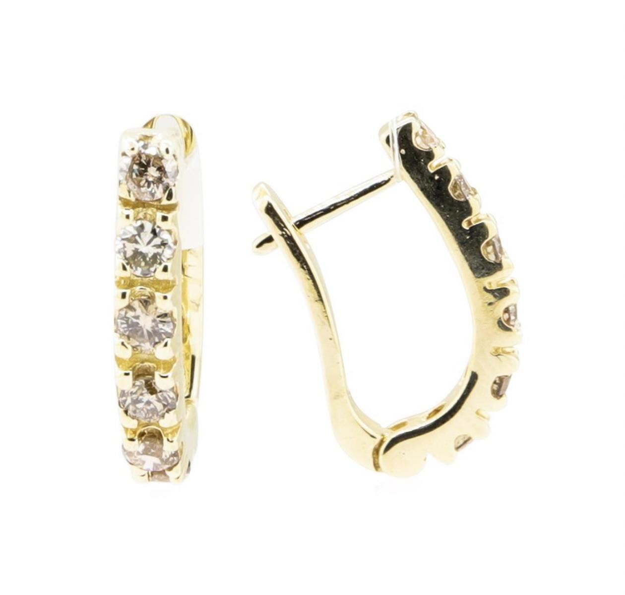 One pair electronically tested 14KT yellow gold lady's combination cast & assembled j-hoop earrings with hinged clip backs with a bright polish finish. Identified with markings of '14K'. Condition is new, good workmanship. Containing: Twelve prong set round brilliant cut diamonds, measuring 2.70 - 2.60 x 1.64mm (depth est.) approximate total weight of 12 Stones = 0.85ct. Graded in the setting. Color I - J Clarity VS-2 to SI-1 Cut Good. Total Weight of Diamonds 0.85ct.. Total Weight of Earrings 4.50gm GAS Appraised at $2725.00. GAS Appraised.
