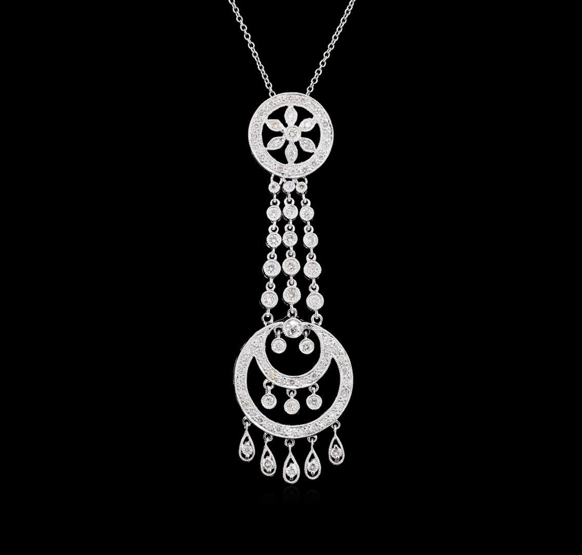 One electronically tested 18KT white gold ladies cast & assembled diamond pendant with chain. The two and one-half inch length pendant features a stylized diamond chandelier with hanging diamond fringe suspended by three flexible diamond ribbons from a diamond floret disc, completed by a hidden bail. The pendant is supported by a sixteen inch length 14KT white gold cable chain, terminating in a spring ring clasp. Bright polish finish with milgrain detailing. Identified with markings of "18K 750". Condition is new, good workmanship. Containing: One bezel set round brilliant cut diamond, measuring 2.40 - 2.30 x 1.41mm (depth est.) approximate weight of 0.05ct. Graded in the setting. Clarity: SI-2. Color: G Twenty-Three prong & bezel set round brilliant cut diamonds, measuring 1.90 - 1.60 x 1.05mm (depth est.) approximate total weight of 23 Stones = 0.44ct. Graded in the setting. Clarity: SI-2 to I-1. Color: G - H Sixty-One prong & bezel set round brilliant cut diamonds, measuring 1.20 - 1.10 x 0.69mm (depth est.) approximate total weight of 61 Stones = 0.36ct. Graded in the setting. Clarity: SI-2 to I-1. Color: G - I. Total Weight of Diamonds 0.85ct. Total Weight of Pendant With Chain 8.03gm. AIG Appraised at $4,535.00.