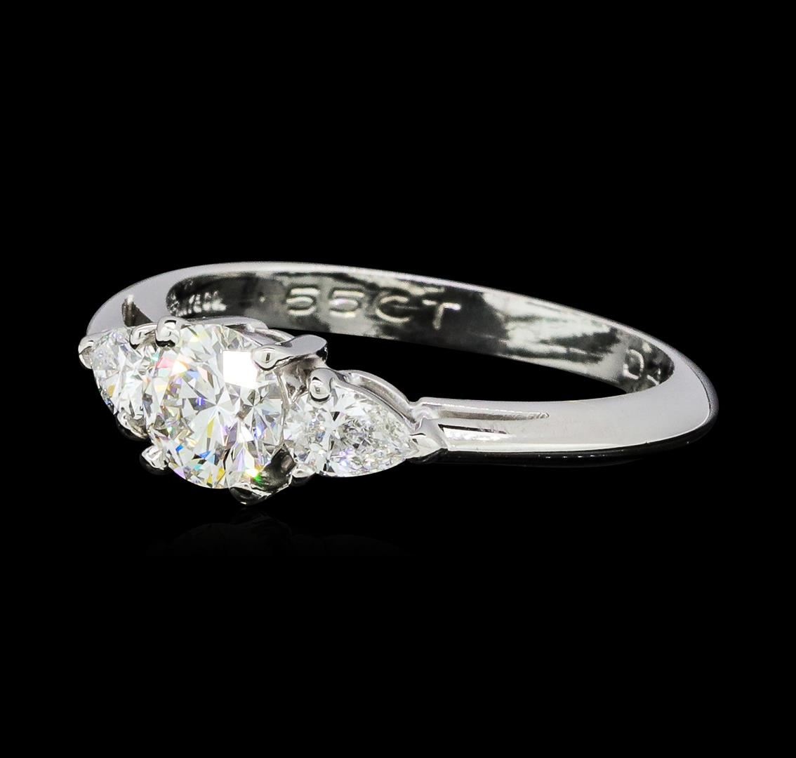 One electronically tested platinum lady's cast wedding ring with a three stone cathedral shank with a bright polish finish. The featured lady's ring has a knife edge shank measuring 2.18 millimeters wide. Trademark is Tiffany & Co. Identified with markings of 'PT 950'. Condition is new, good workmanship. Containing: One prong set round brilliant cut diamond, measuring 5.28 - 5.21 x 3.22mm (depth est.) approximate weight of 0.55ct. Graded in the setting. Color I Clarity VS-1 Cut Ideal Two prong set pear shaped cut diamonds, measuring 4.60 x 2.85 x 1.80mm (depth est.) approximate total weight of 2 Stones = 0.30ct. Graded in the setting. Color F - G Clarity VS-1 to VS-2 Cut Very Good. Total Weight of Diamonds 0.85ct.. Total Weight of Ring 4.50gm GAS Appraised at $7505.00. GAS Appraised at $7,505.00.