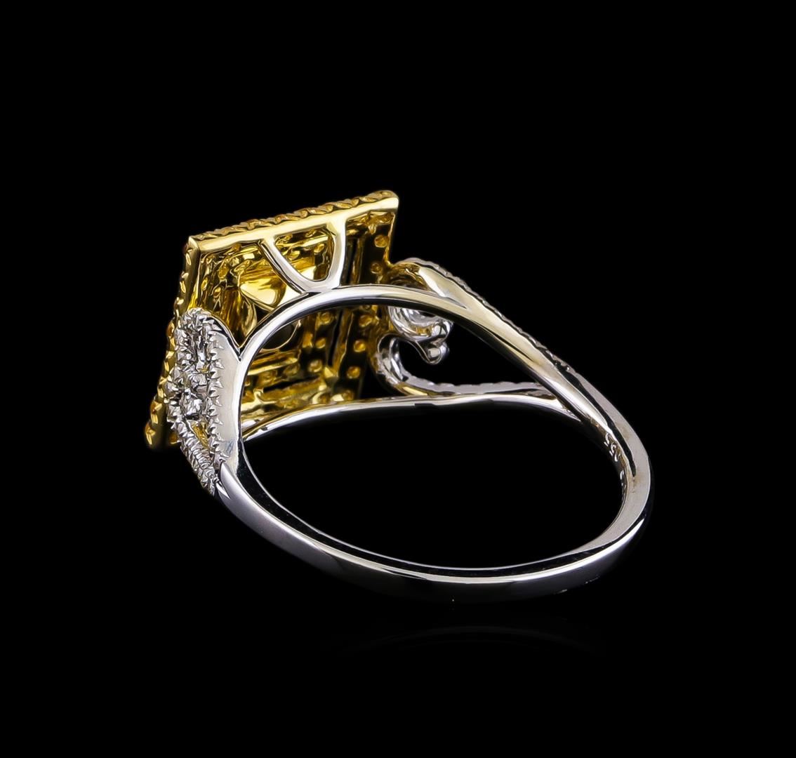 One electronically tested 14KT yellow gold ladies cast diamond and yellow sapphire ring. The featured diamond is set within a tiered yellow sapphire bezel supported by diamond set heart shoulders, completed by a one millimeter wide band. Bright polish finish with rhodium accents. Identified with markings of "14K". Condition is new, good workmanship. Containing: One prong set princess cut diamond, measuring 4.80 x 4.60 x 3.45mm (depth est.) approximate weight of 0.66ct. Graded in the setting. Clarity: I-2. Color: GDepth 75.0%. Table 76.1%. Fifty-Four prong set round brilliant cut diamonds, measuring 1.00 - 0.90 x 0.57mm (depth est.) approximate total weight of 54 Stones = 0.19ct. Color & clarity grade are an average for the group. Graded in the setting. Clarity: SI-2 to I-1. Color: G - I Forty-eight prong set round mixed cut natural yellow sapphires, measuring 1.30 - 1.30 x 0.85 mm, approximate total weight of 0.55ct., clarity is eye clean, type II, medium, moderately strong, orangy yellow color, (GIA oY 5/4), cut is good. Transmitting light with no distortion, transparent. Measurements & the color grade are an average for the group. Graded in the setting.Total Weight of Colored Stones 0.55ct. Total Weight of Diamonds 0.85ct. Total Weight of Ring 3.11gm. AIG Appraised.