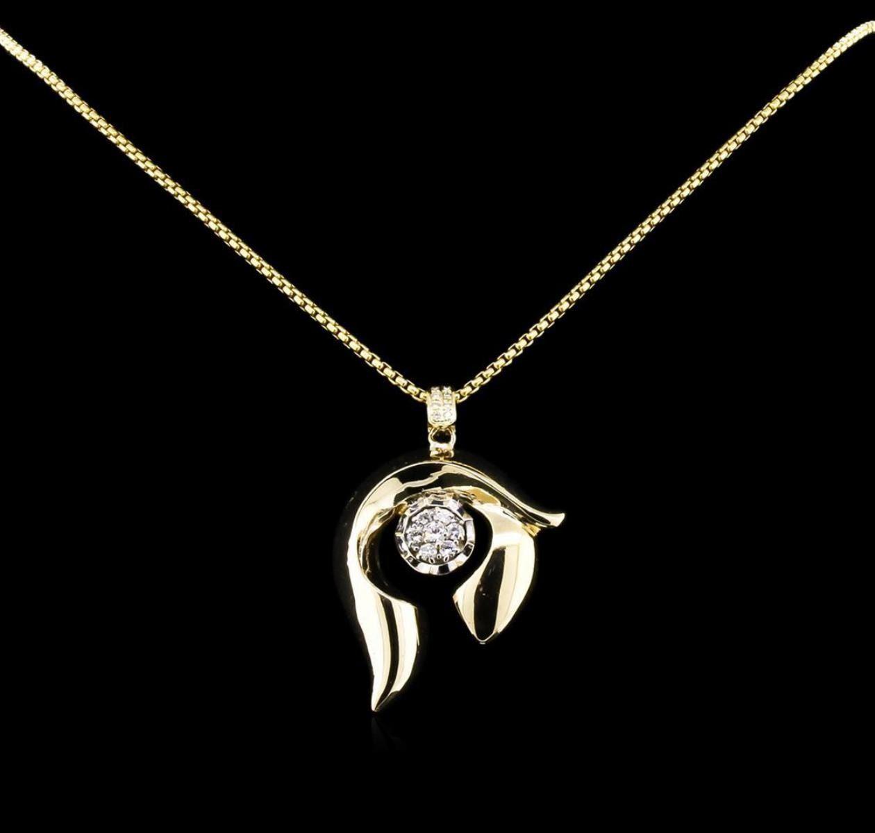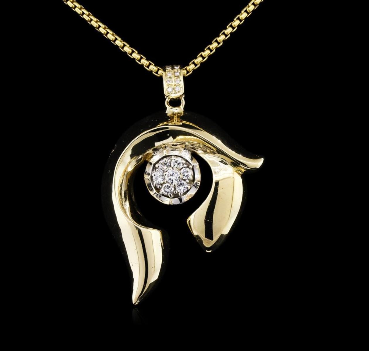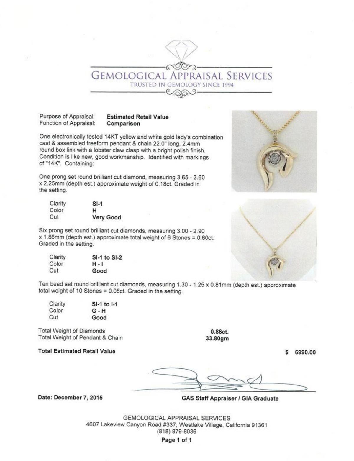 One electronically tested 14KT yellow and white gold lady's combination cast & assembled freeform pendant & chain 22.0" long, 2.4mm round box link with a lobster claw clasp with a bright polish finish. Identified with markings of "14K". Condition is like new, good workmanship. Containing: One prong set round brilliant cut diamond, measuring 3.65 - 3.60 x 2.25mm (depth est.) approximate weight of 0.18ct. Graded in the setting. Clarity: SI-1. Color: Very Good Six prong set round brilliant cut diamonds, measuring 3.00 - 2.90 x 1.86mm (depth est.) approximate total weight of 6 Stones = 0.60ct. Graded in the setting. Clarity: SI-1 to SI-2. Color: H - I. Cut Good Ten bead set round brilliant cut diamonds, measuring 1.30 - 1.25 x 0.81mm (depth est.) approximate total weight of 10 Stones = 0.08ct. Graded in the setting. Clarity: SI-1 to I-1. Color: G - Good. Total Weight of Diamonds 0.86ct. Total Weight of Pendant & Chain 33.80gm. GAS Appraised.