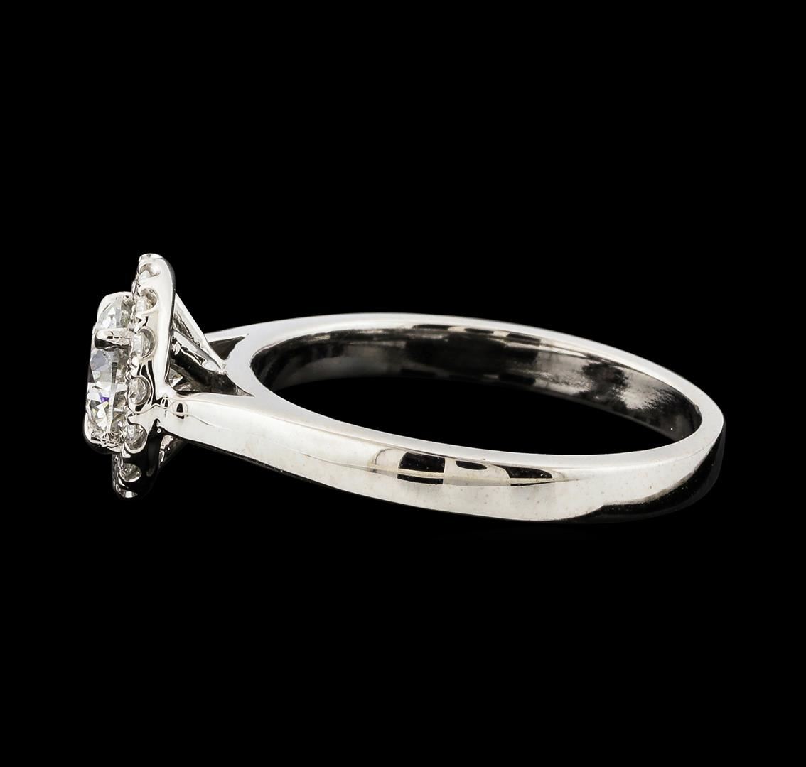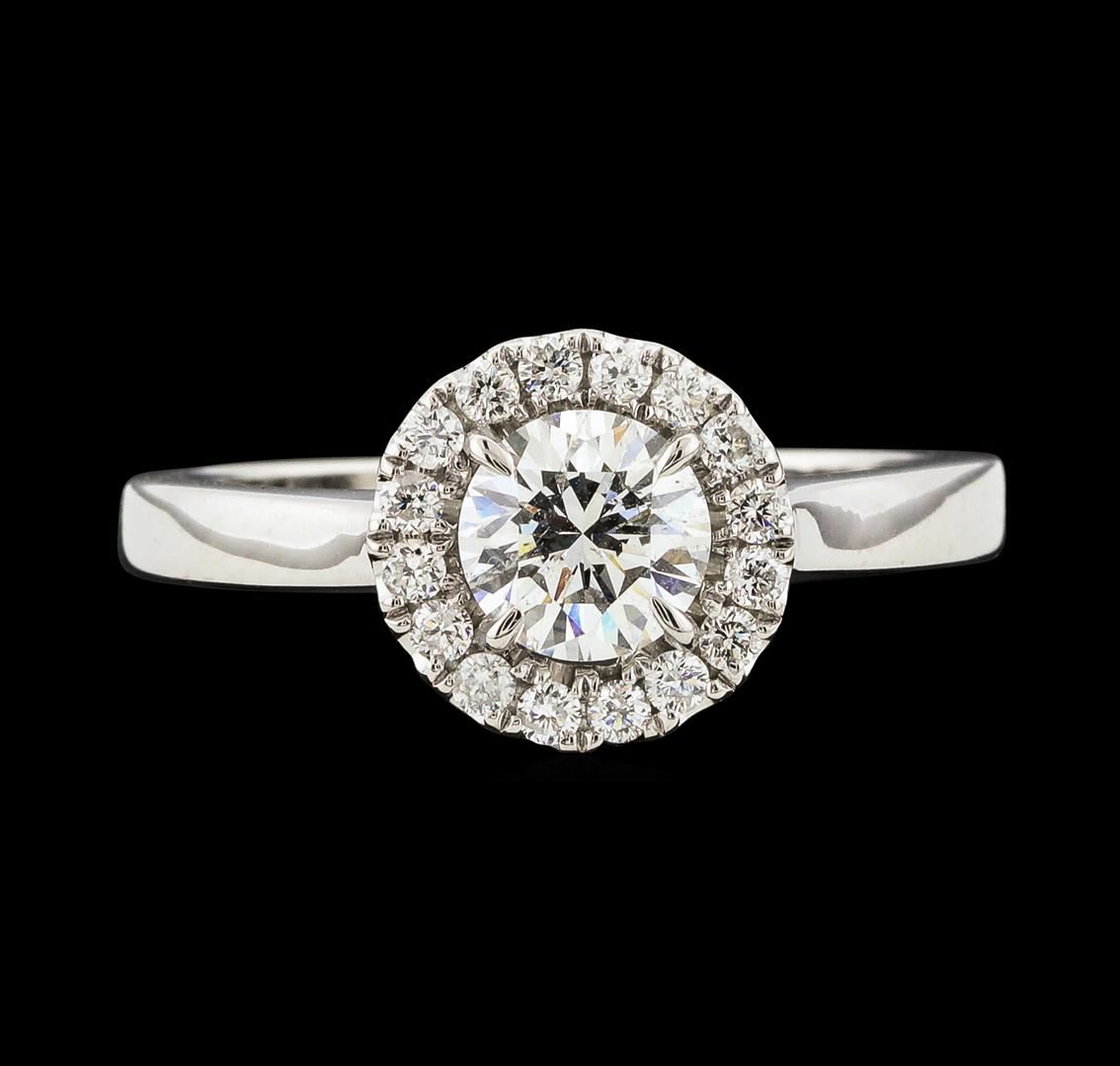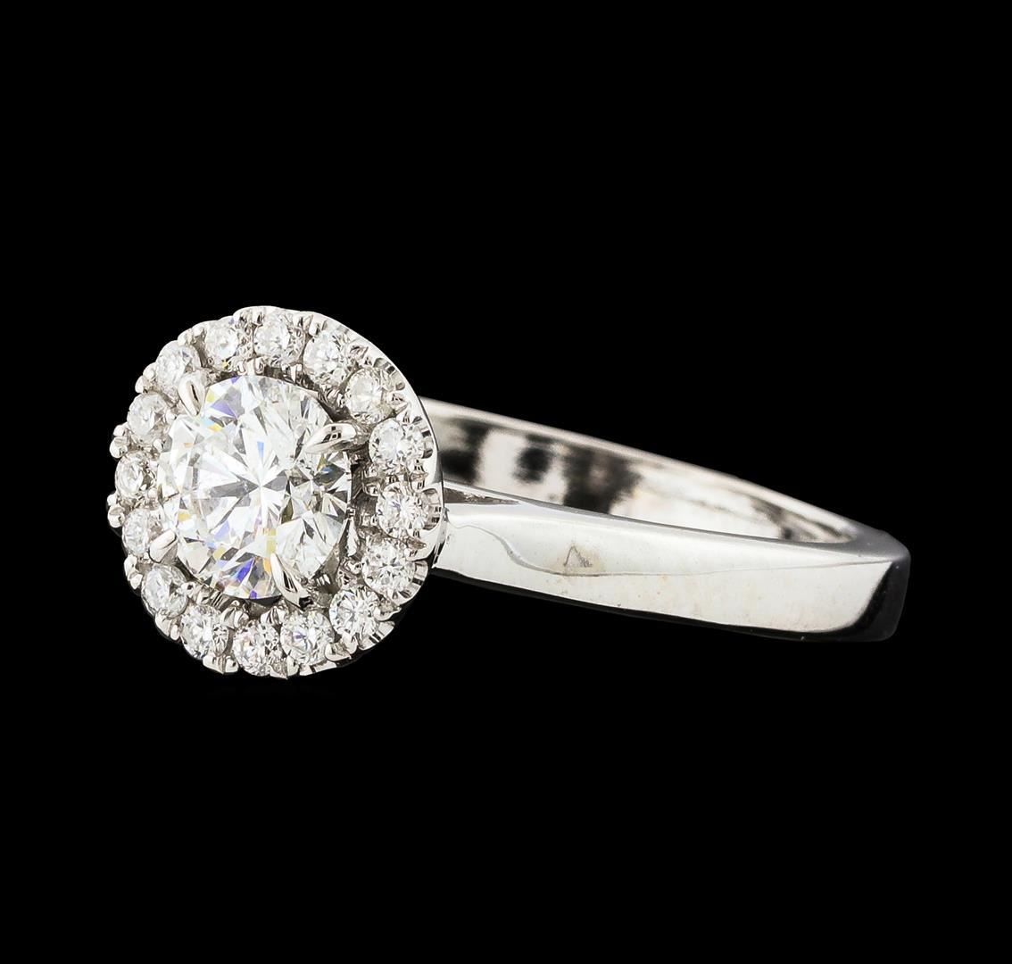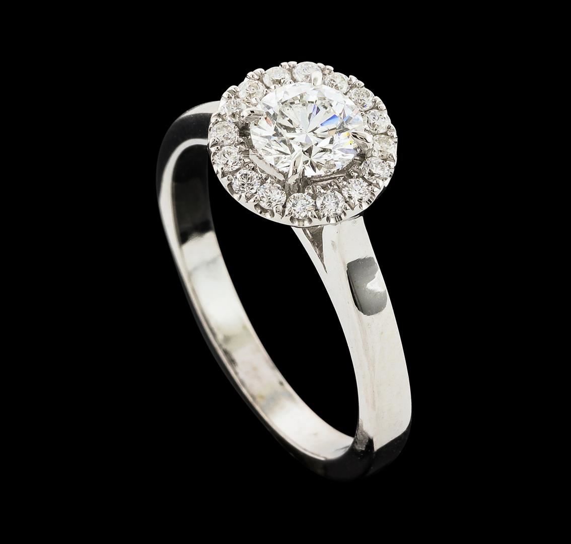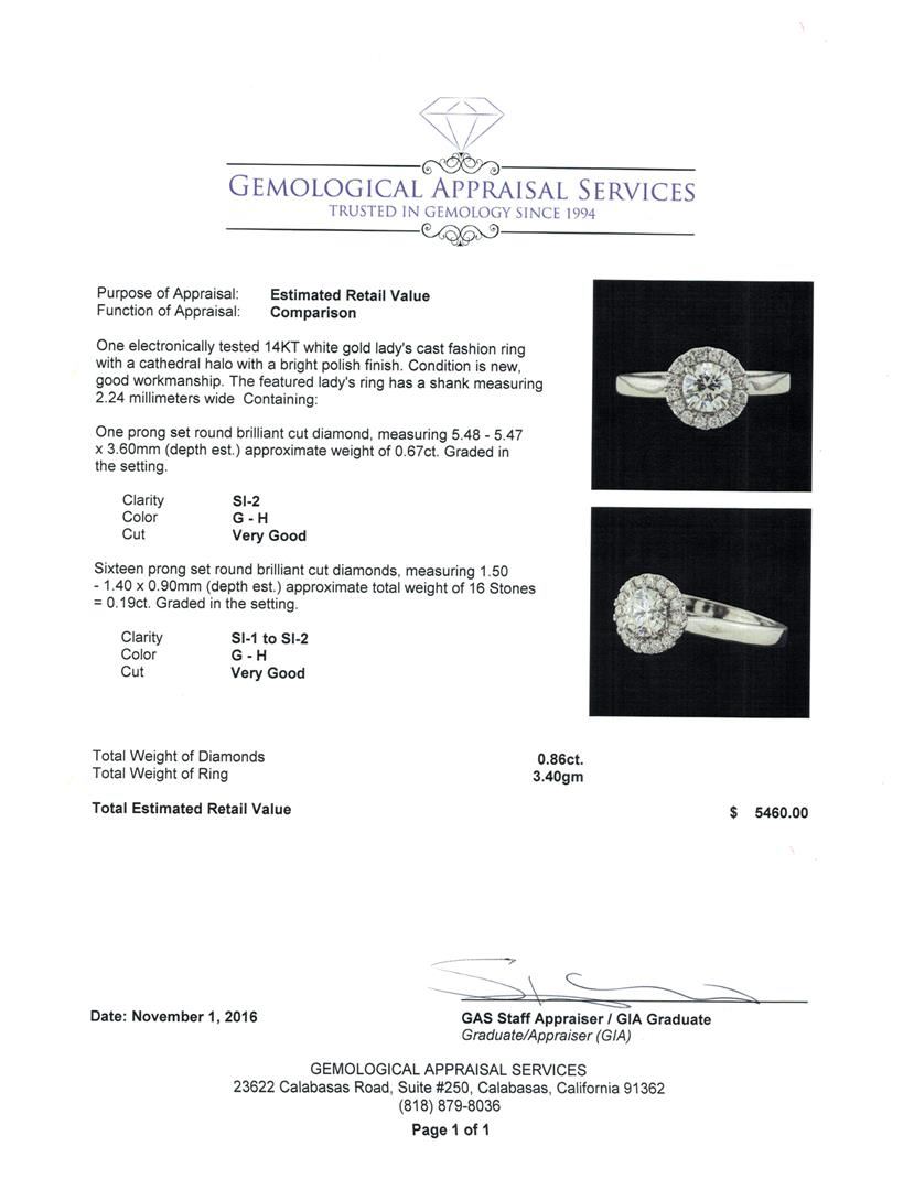One electronically tested 14KT white gold lady's cast fashion ring with a cathedral halo with a bright polish finish. The featured lady's ring has a shank measuring 2.24 millimeters wide Condition is new, good workmanship. Containing: One prong set round brilliant cut diamond, measuring 5.48 - 5.47 x 3.60mm (depth est.) approximate weight of 0.67ct. Graded in the setting. Clarity SI-2. Color: G - H Cut Very Good Sixteen prong set round brilliant cut diamonds, measuring 1.50 - 1.40 x 0.90mm (depth est.) approximate total weight of 16 Stones = 0.19ct. Graded in the setting. Clarity SI-1 to SI-2. Color: G - H Cut Very Good. Total Weight of Diamonds 0.86ct.. Total Weight of Ring 3.40gm. GAS Appraised at $5,460.00.