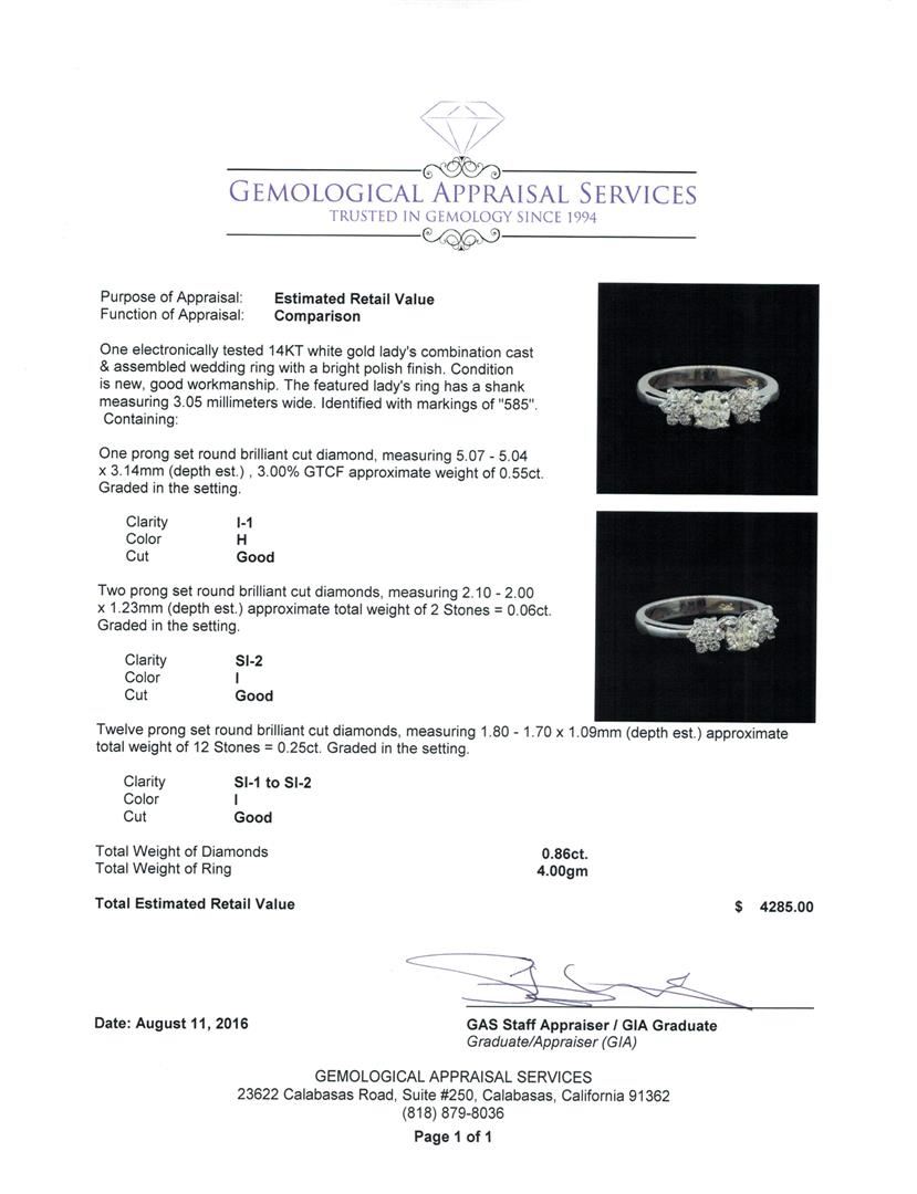 One electronically tested 14KT white gold lady's combination cast & assembled wedding ring with a bright polish finish. The featured lady's ring has a shank measuring 3.05 millimeters wide. Identified with markings of '585'. Condition is new, good workmanship. Containing: One prong set round brilliant cut diamond, measuring 5.07 - 5.04 x 3.14mm (depth est.) , 3.00.%. GTCF approximate weight of 0.55ct. Graded in the setting. Clarity I-1. Color: H Cut Good Two prong set round brilliant cut diamonds, measuring 2.10 - 2.00 x 1.23mm (depth est.) approximate total weight of 2 Stones = 0.06ct. Graded in the setting. Clarity SI-2. Color: I Cut Good Twelve prong set round brilliant cut diamonds, measuring 1.80 - 1.70 x 1.09mm (depth est.) approximate total weight of 12 Stones = 0.25ct. Graded in the setting. Clarity SI-1 to SI-2. Color: I Cut Good. Total Weight of Diamonds 0.86ct.. Total Weight of Ring 4.00gm. GAS Appraised.