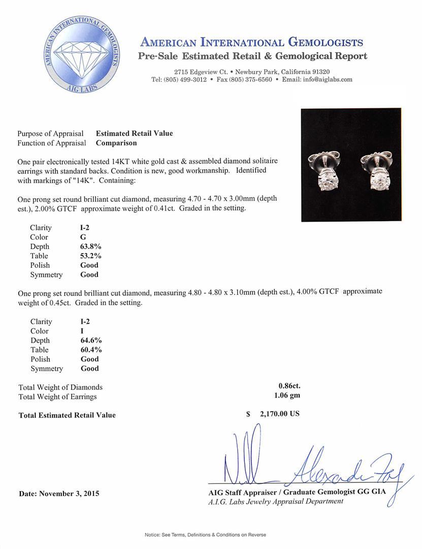 One pair electronically tested 14KT white gold cast & assembled diamond solitaire earrings with standard backs. Identified with markings of "14K". Condition is new, good workmanship. Containing: One prong set round brilliant cut diamond, measuring 4.70 - 4.70 x 3.00mm (depth est.), 2.00% GTCF approximate weight of 0.41ct. Graded in the setting. Clarity: I-2. Color: 63.8%. Table 53.2%. One prong set round brilliant cut diamond, measuring 4.80 - 4.80 x 3.10mm (depth est.), 4.00% GTCF approximate weight of 0.45ct. Graded in the setting. Clarity: I-2. Color: I. Depth 64.6%. Table 60.4%. Total Weight of Diamonds 0.86ct. Total Weight of Earrings 1.06gm. AIG Appraised at $2,170.00.