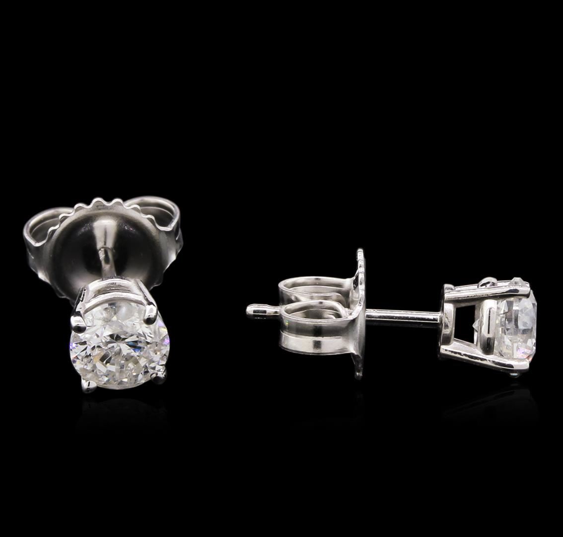 One pair electronically tested 14KT white gold cast & assembled diamond solitaire earrings with standard backs. Identified with markings of "14K". Condition is new, good workmanship. Containing: One prong set round brilliant cut diamond, measuring 4.70 - 4.70 x 3.00mm (depth est.), 2.00% GTCF approximate weight of 0.41ct. Graded in the setting. Clarity: I-2. Color: 63.8%. Table 53.2%. One prong set round brilliant cut diamond, measuring 4.80 - 4.80 x 3.10mm (depth est.), 4.00% GTCF approximate weight of 0.45ct. Graded in the setting. Clarity: I-2. Color: I. Depth 64.6%. Table 60.4%. Total Weight of Diamonds 0.86ct. Total Weight of Earrings 1.06gm. AIG Appraised at $2,170.00.