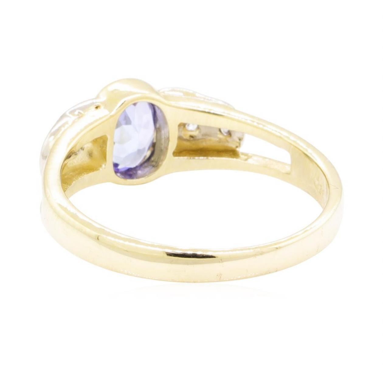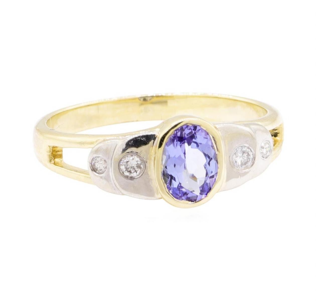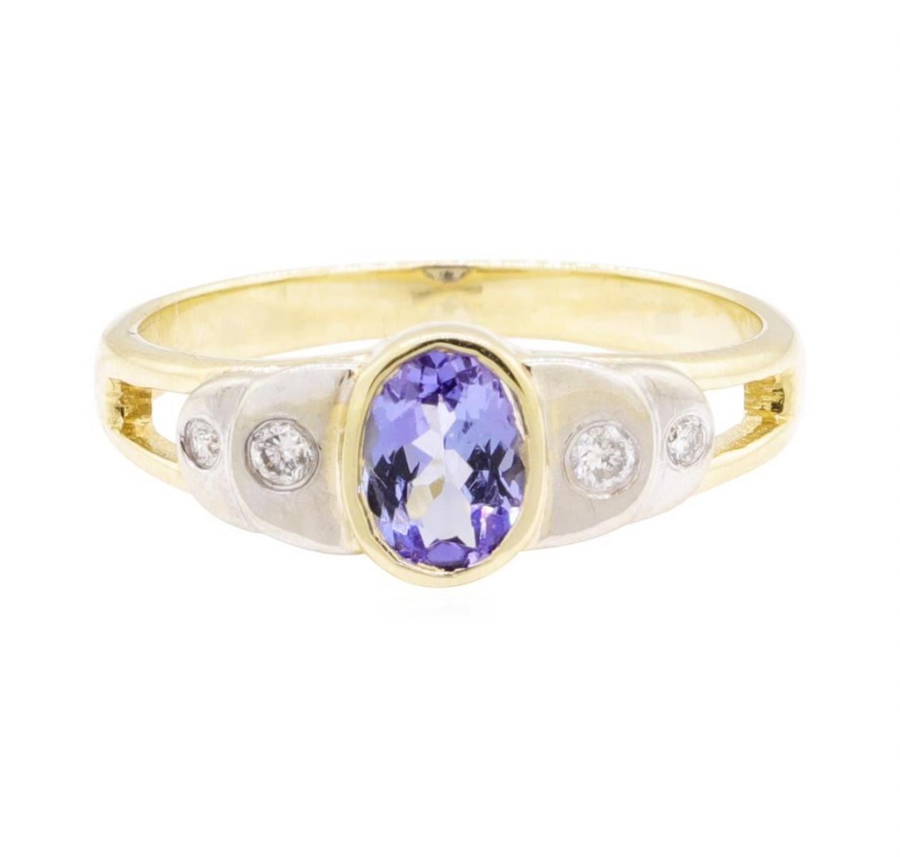 One electronically tested 14KT yellow and white gold lady's combination cast & assembled fashion ring with a split shank with a bright polish finish. The featured lady's ring has a shank measuring 2.40 millimeters wide. Identified with markings of '14K'. Condition is like new, good workmanship. Containing: One bezel set oval modified mixed cut natural tanzanite, measuring 7.20 x 5.30 x 2.76mm, (depth est.) approximate weight of 0.75ct., clarity is eye clean, medium light, very slightly grayish, violetish blue color, (GIA vB 4/3), cut is good. Transmitting light with no distortion, transparent. Colored gemstones are presumed to have been subjected to commonly used enhancement processes. Graded in the setting. Four bezel set round brilliant cut diamonds, measuring 2.00 - 1.80 x 1.18mm (depth est.) approximate total weight of 4 Stones = 0.11ct. Graded in the setting. Color H - I Clarity SI-2 to I-1 Cut Good. Total Weight of Colored Stones 0.75ct.. Total Weight of Diamonds 0.11ct.. Total Weight of Ring 3.50gm GAS Appraised at $1110.00. GAS Appraised.