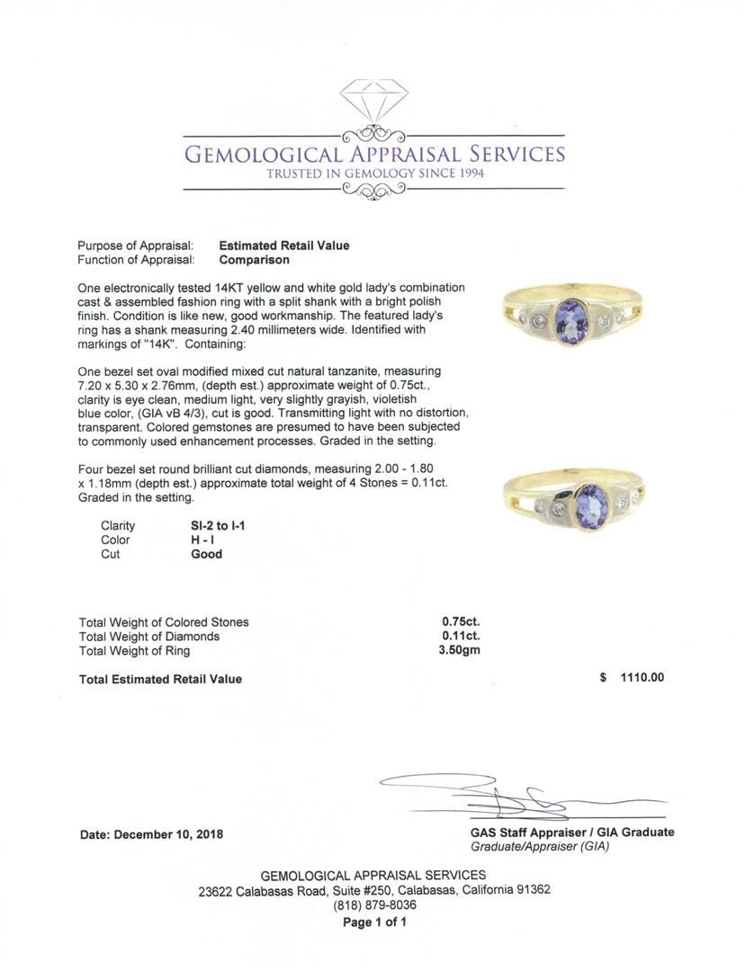 One electronically tested 14KT yellow and white gold lady's combination cast & assembled fashion ring with a split shank with a bright polish finish. The featured lady's ring has a shank measuring 2.40 millimeters wide. Identified with markings of '14K'. Condition is like new, good workmanship. Containing: One bezel set oval modified mixed cut natural tanzanite, measuring 7.20 x 5.30 x 2.76mm, (depth est.) approximate weight of 0.75ct., clarity is eye clean, medium light, very slightly grayish, violetish blue color, (GIA vB 4/3), cut is good. Transmitting light with no distortion, transparent. Colored gemstones are presumed to have been subjected to commonly used enhancement processes. Graded in the setting. Four bezel set round brilliant cut diamonds, measuring 2.00 - 1.80 x 1.18mm (depth est.) approximate total weight of 4 Stones = 0.11ct. Graded in the setting. Color H - I Clarity SI-2 to I-1 Cut Good. Total Weight of Colored Stones 0.75ct.. Total Weight of Diamonds 0.11ct.. Total Weight of Ring 3.50gm GAS Appraised at $1110.00. GAS Appraised.