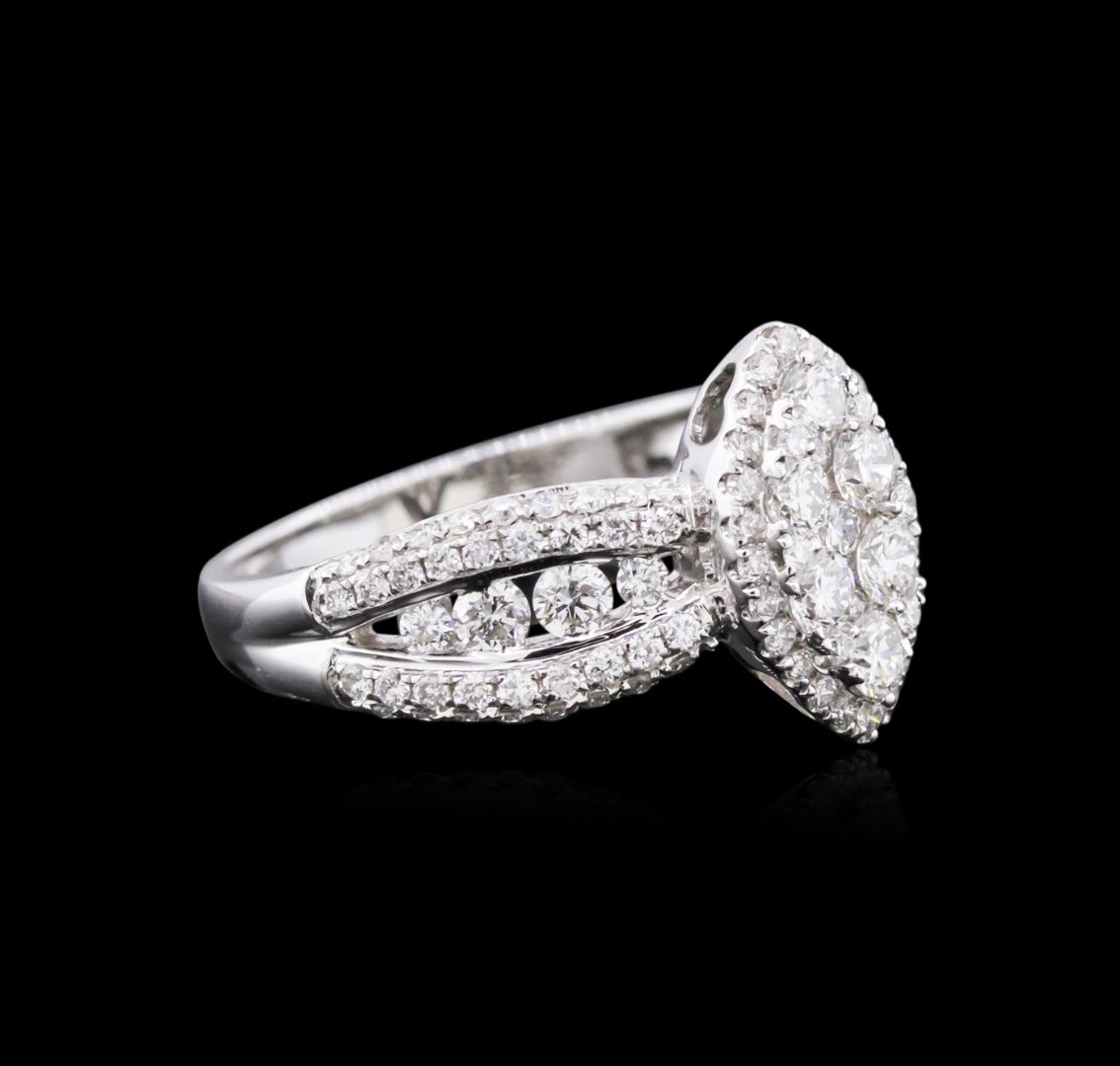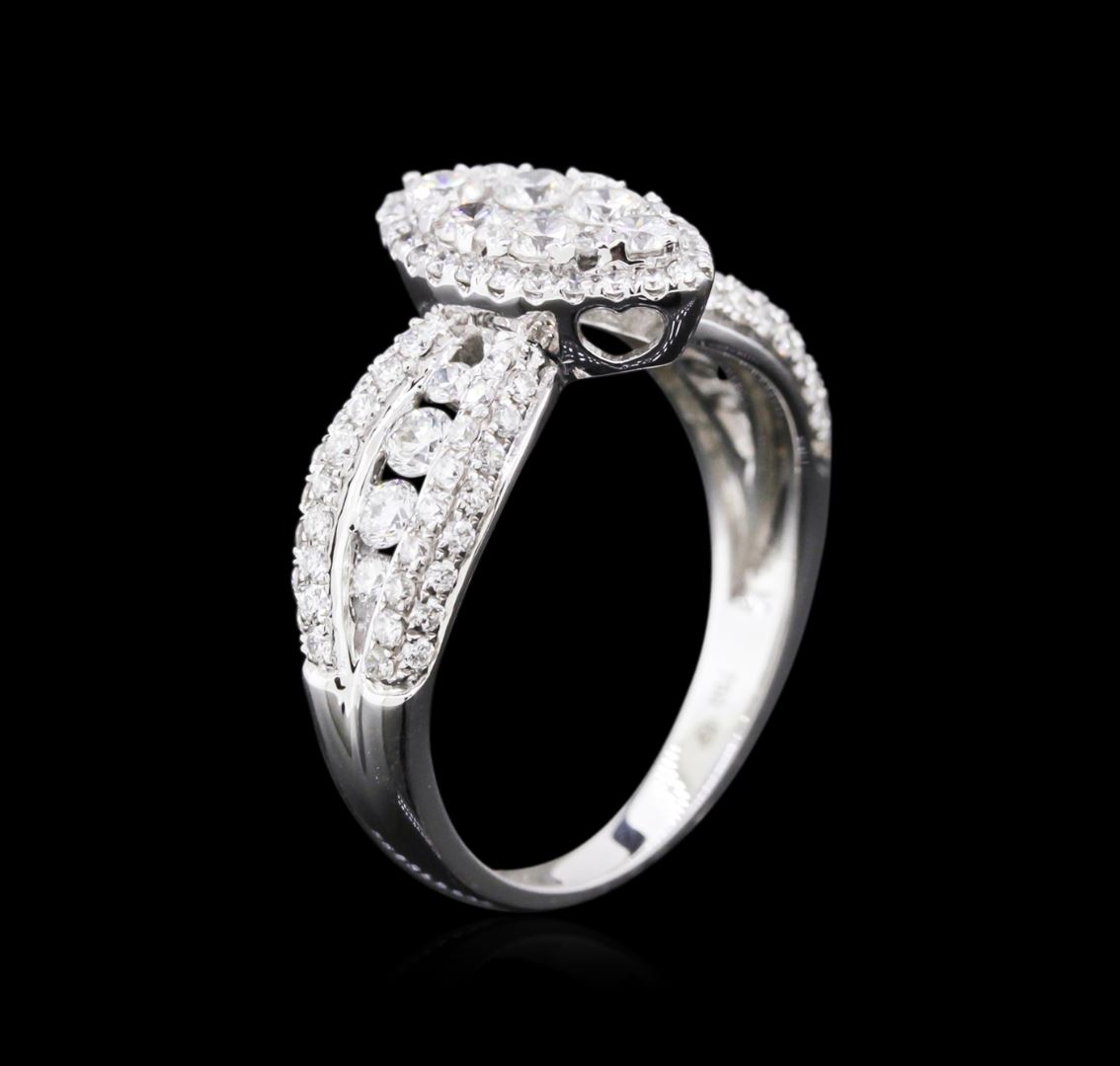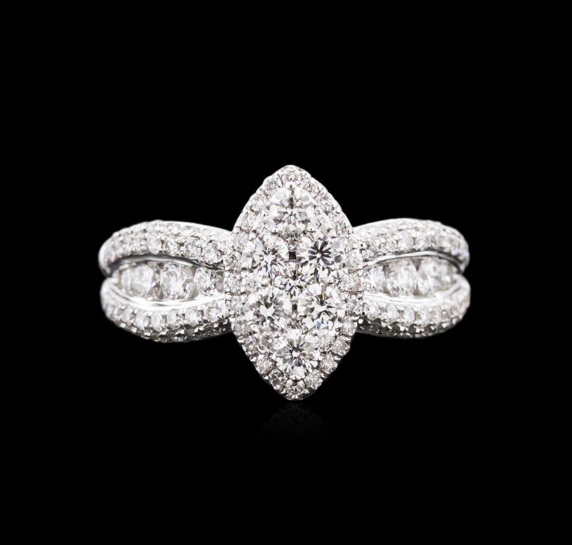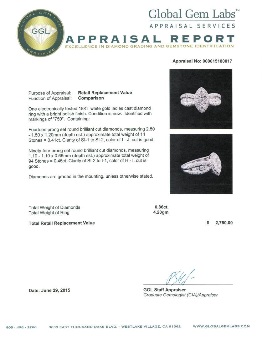 One electronically tested 18KT white gold ladies cast diamond ring with a bright polish finish. Identified with markings of "750". Condition is new. Containing: Fourteen prong set round brilliant cut diamonds, measuring 2.50 - 1.50 x 1.20mm (depth est.) approximate total weight of 14 Stones = 0.41ct. Clarity: SI-1 to SI-2. Color: I - J, Cut is Good. Ninety-Four prong set round brilliant cut diamonds, measuring 1.10 - 1.10 x 0.66mm (depth est.) approximate total weight of 94 Stones = 0.45ct. Clarity: SI-2 to I-1. Color: H - I, Cut is Good. Diamonds are graded in the mounting, unless otherwise stated. Total Weight of Diamonds 0.86ct. Total Weight of Ring 4.20 grams. GGL Appraised at $2,750.00.