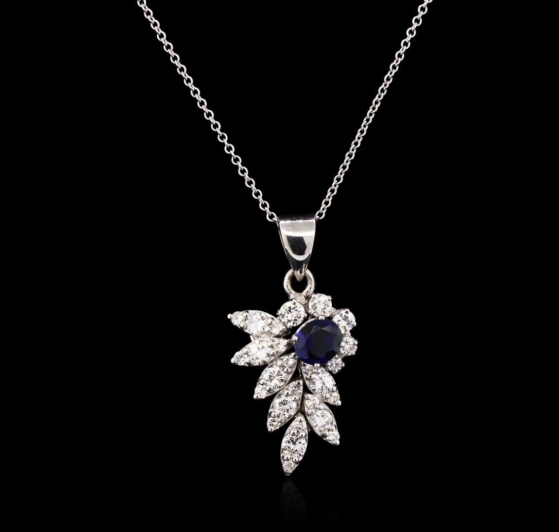 One electronically tested 14KT white gold lady's combination cast & assembled fashion pendant & chain 18.0" long, 1mm round cable link with a spring ring clasp with a bright polish finish. Identified with markings of "14K". Condition is new, good workmanship. Containing: One prong set oval modified brilliant cut natural blue sapphire, measuring 6.27 x 5.41 x 3.07mm, approximate weight of 0.87ct., clarity is eye clean, type II, medium dark, strong, blue color, (GIA B 6/5), cut is very good. Colored gemstones are presumed to have been subjected to commonly used enhancement processes. Graded in the setting. Ten prong set round brilliant cut diamonds, measuring 3.30 - 3.00 x 2.05mm (depth est.) approximate total weight of 10 Stones = 1.25ct. Graded in the setting. Clarity: VS-1 to VS-2. Color: H - I. Cut Good Two prong set round brilliant cut diamonds, measuring 2.50 - 2.20 x 1.53mm (depth est.) approximate total weight of 2 Stones = 0.10ct. Graded in the setting. Clarity: VS-2 to SI-1. Color: H - I. Cut Good Fourteen prong set round brilliant cut diamonds, measuring 1.80 - 1.70 x 1.14mm (depth est.) approximate total weight of 14 Stones = 0.30ct. Graded in the setting. Clarity: VS-2 to SI-1. Color: H - I. Cut Good. Total Weight of Colored Stones 0.87ct. Total Weight of Diamonds 1.65ct. Total Weight of Pendant & Chain 7.70gm. GAS Appraised at $8,460.00.