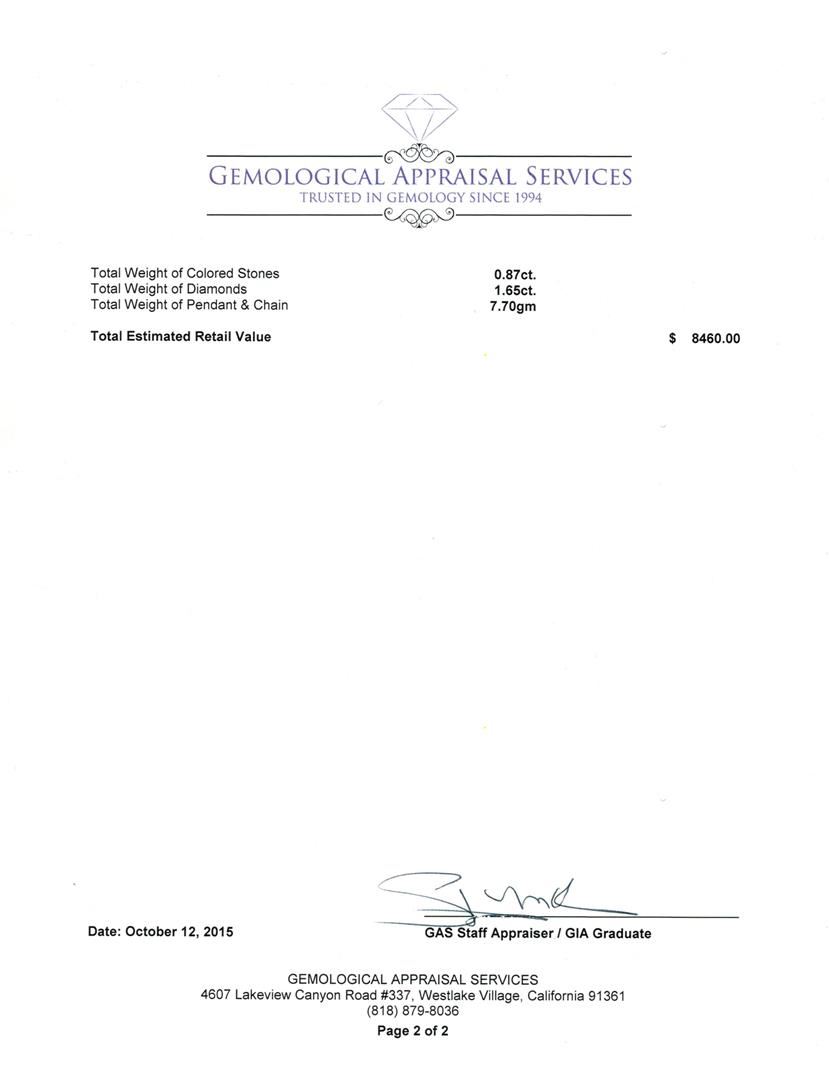 One electronically tested 14KT white gold lady's combination cast & assembled fashion pendant & chain 18.0" long, 1mm round cable link with a spring ring clasp with a bright polish finish. Identified with markings of "14K". Condition is new, good workmanship. Containing: One prong set oval modified brilliant cut natural blue sapphire, measuring 6.27 x 5.41 x 3.07mm, approximate weight of 0.87ct., clarity is eye clean, type II, medium dark, strong, blue color, (GIA B 6/5), cut is very good. Colored gemstones are presumed to have been subjected to commonly used enhancement processes. Graded in the setting. Ten prong set round brilliant cut diamonds, measuring 3.30 - 3.00 x 2.05mm (depth est.) approximate total weight of 10 Stones = 1.25ct. Graded in the setting. Clarity: VS-1 to VS-2. Color: H - I. Cut Good Two prong set round brilliant cut diamonds, measuring 2.50 - 2.20 x 1.53mm (depth est.) approximate total weight of 2 Stones = 0.10ct. Graded in the setting. Clarity: VS-2 to SI-1. Color: H - I. Cut Good Fourteen prong set round brilliant cut diamonds, measuring 1.80 - 1.70 x 1.14mm (depth est.) approximate total weight of 14 Stones = 0.30ct. Graded in the setting. Clarity: VS-2 to SI-1. Color: H - I. Cut Good. Total Weight of Colored Stones 0.87ct. Total Weight of Diamonds 1.65ct. Total Weight of Pendant & Chain 7.70gm. GAS Appraised at $8,460.00.