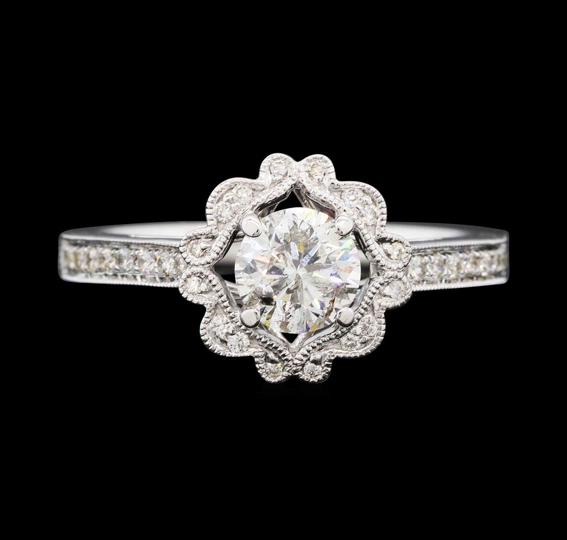 One electronically tested 14KT white gold lady's cast wedding ring with a cathedral shank with a bright polish with milgrain detailing finish. The featured lady's ring has a scalloped halo and a shank measuring 2.15 millimeters wide. Identified with markings of '14K'. Condition is new, good workmanship. Containing: One prong set round brilliant cut diamond, measuring 5.57 - 5.55 x 3.58mm (depth est.) , 5.00.%. GTCF approximate weight of 0.70ct. Graded in the setting. Color H - I Clarity I-1 Cut Very Good Eighteen prong set round brilliant cut diamonds, measuring 1.30 - 1.20 x 0.75mm (depth est.) approximate total weight of 18 Stones = 0.13ct. Graded in the setting. Color H - I Clarity SI-1 to SI-2 Cut Good Sixteen prong set round brilliant cut diamonds, measuring 1.00 - 0.90 x 0.57mm (depth est.) approximate total weight of 16 Stones = 0.04ct. Graded in the setting. Color H - I Clarity SI-1 to SI-2 Cut Good. Total Weight of Diamonds 0.87ct.. Total Weight of Ring 3.40gm GAS Appraised at $6,160.00.