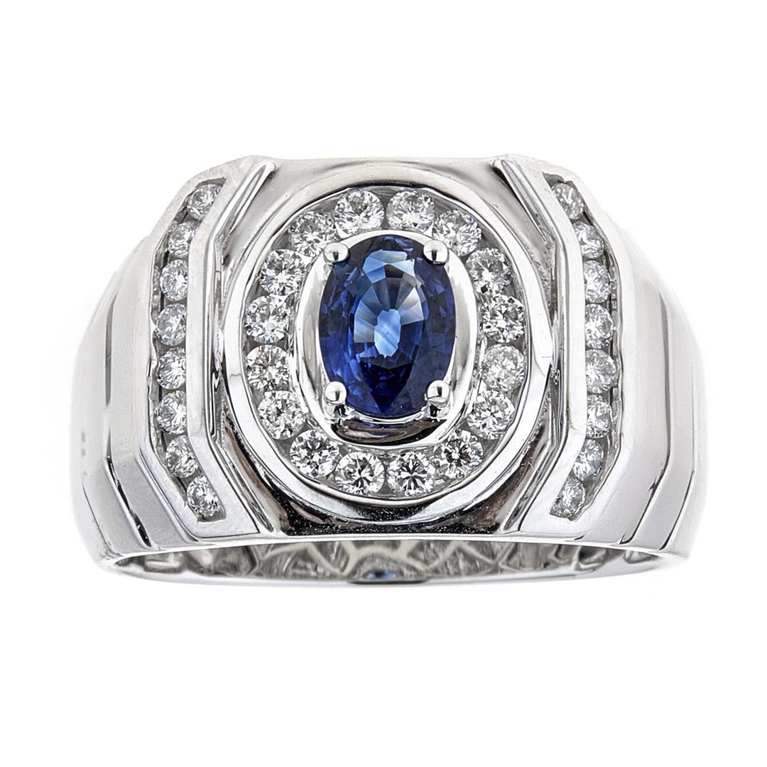 One Sapphire and Diamond Ring. Setting: 14 Kt. White Gold Mounting. Additional: 32 Round Diamonds = 0.70 Cts. TWT (G-H/SI-I1). Center Gem Stone Information: Species: Natural Corundum. Variety: Sapphire. Shape and Cut: Oval Mixed Cut. Measurements: 7.05 x 5.08 x 3.00 mm. Weight: 0.87 Carats. Transparency: Transparent. Color Hue: Blue. Saturation: Moderately Strong. Total Weight: 11.18 grams.