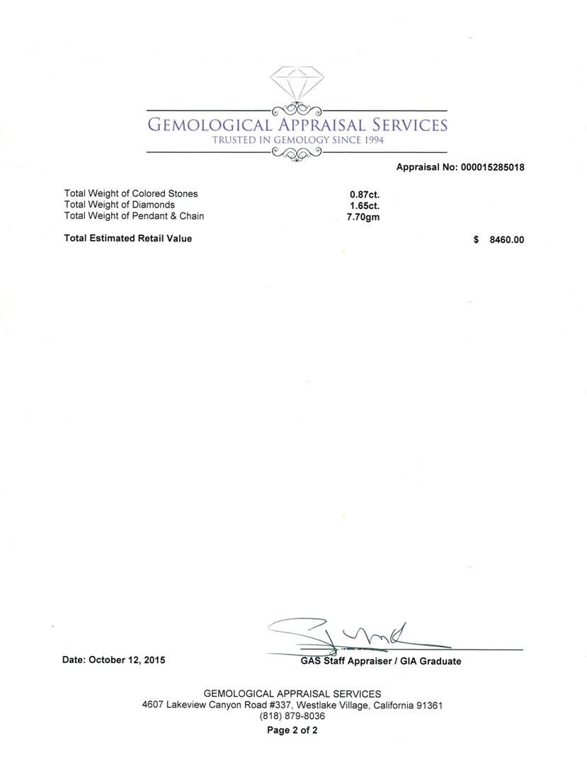 One electronically tested 14KT white gold lady's combination cast & assembled fashion pendant & chain 18.0" long, 1mm round cable link with a spring ring clasp with a bright polish finish. Identified with markings of "14K". Condition is new, good workmanship. Containing: One prong set oval modified brilliant cut natural blue sapphire, measuring 6.27 x 5.41 x 3.07mm, approximate weight of 0.87ct., clarity is eye clean, type II, medium dark, strong, blue color, (GIA B 6/5), cut is very good. Colored gemstones are presumed to have been subjected to commonly used enhancement processes. Graded in the setting. Ten prong set round brilliant cut diamonds, measuring 3.30 - 3.00 x 2.05mm (depth est.) approximate total weight of 10 Stones = 1.25ct. Graded in the setting. Clarity: VS-1 to VS-2. Color: H - I. Cut Good Two prong set round brilliant cut diamonds, measuring 2.50 - 2.20 x 1.53mm (depth est.) approximate total weight of 2 Stones = 0.10ct. Graded in the setting. Clarity: VS-2 to SI-1. Color: H - I. Cut Good Fourteen prong set round brilliant cut diamonds, measuring 1.80 - 1.70 x 1.14mm (depth est.) approximate total weight of 14 Stones = 0.30ct. Graded in the setting. Clarity: VS-2 to SI-1. Color: H - I. Cut Good. Total Weight of Colored Stones 0.87ct. Total Weight of Diamonds 1.65ct. Total Weight of Pendant & Chain 7.70gm. GAS Appraised at $8,460.00.