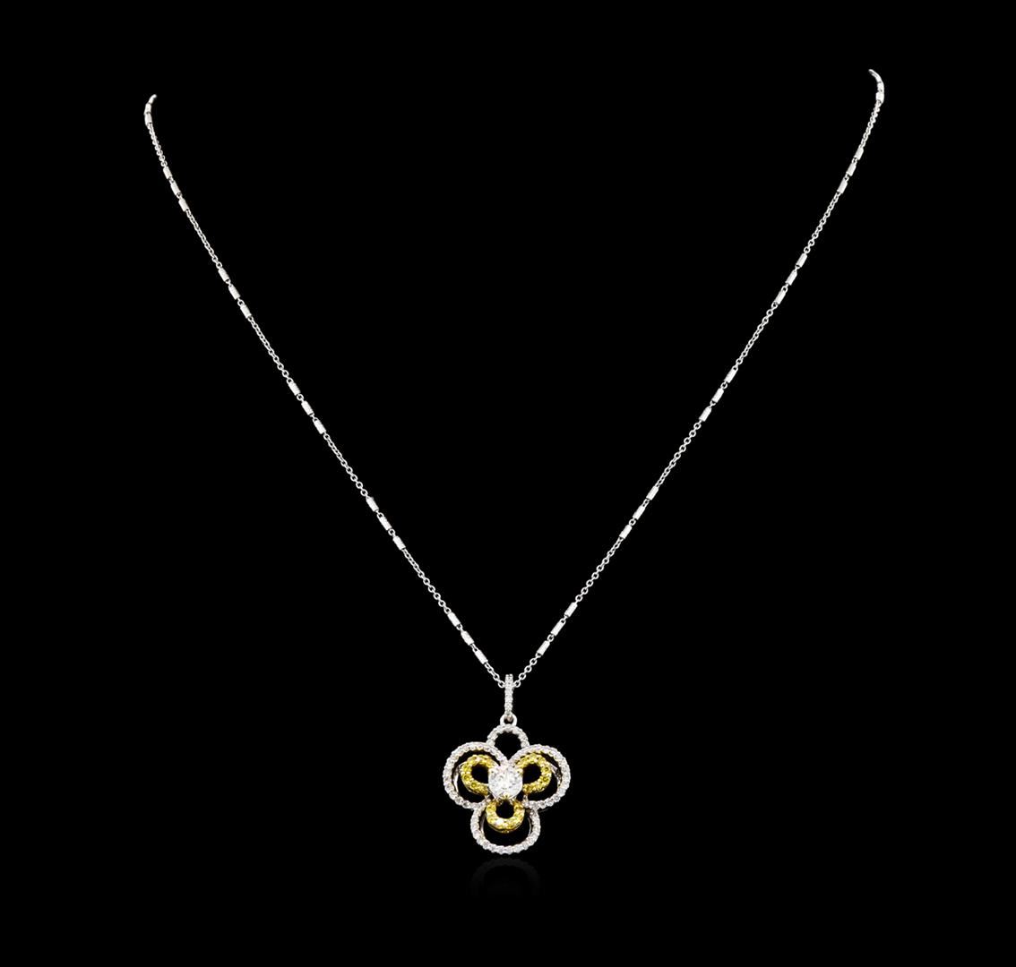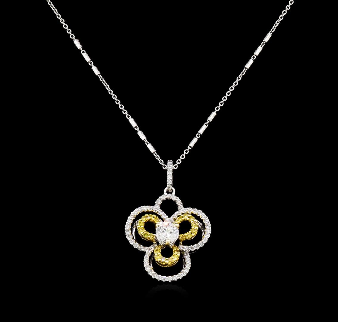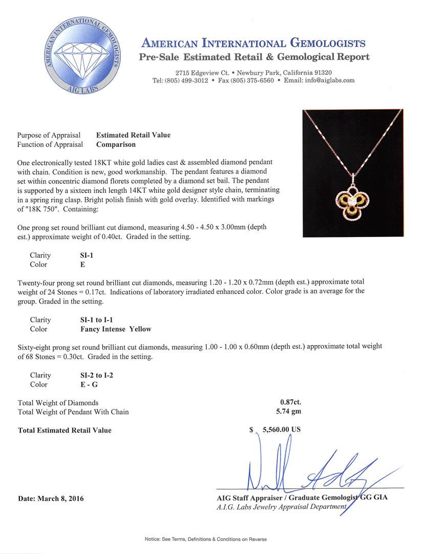 One electronically tested 18KT white gold ladies cast & assembled diamond pendant with chain. The pendant features a diamond set within concentric diamond florets completed by a diamond set bail. The pendant is supported by a sixteen inch length 14KT white gold designer style chain, terminating in a spring ring clasp. Bright polish finish with gold overlay. Identified with markings of "18K 750". Condition is new, good workmanship. Containing: One prong set round brilliant cut diamond, measuring 4.50 - 4.50 x 3.00mm (depth est.) approximate weight of 0.40ct. Graded in the setting. Clarity: SI-1. Color: E Twenty-Four prong set round brilliant cut diamonds, measuring 1.20 - 1.20 x 0.72mm (depth est.) approximate total weight of 24 Stones = 0.17ct. Indications of laboratory irradiated enhanced color. Color grade is an average for the group. Graded in the setting. Clarity: SI-1 to I-1 Sixty-Eight prong set round brilliant cut diamonds, measuring 1.00 - 1.00 x 0.60mm (depth est.) approximate total weight of 68 Stones = 0.30ct. Graded in the setting. Clarity: SI-2 to I-2. Color: E - G. Total Weight of Diamonds 0.87ct. Total Weight of Pendant With Chain 5.74gm. AIG Appraised at $5,560.00.