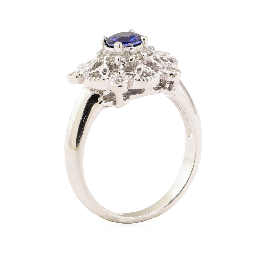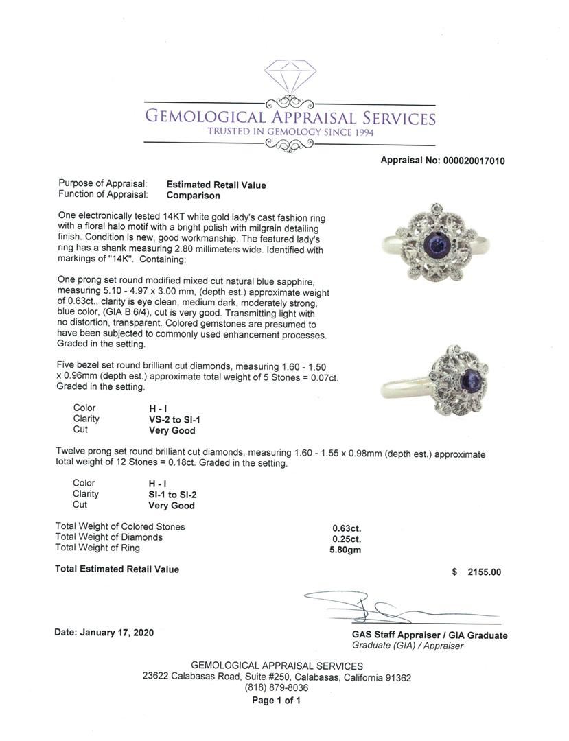 One electronically tested 14KT white gold lady's cast fashion ring with a floral halo motif with a bright polish with milgrain detailing finish. The featured lady's ring has a shank measuring 2.80 millimeters wide. Identified with markings of '14K'. Condi