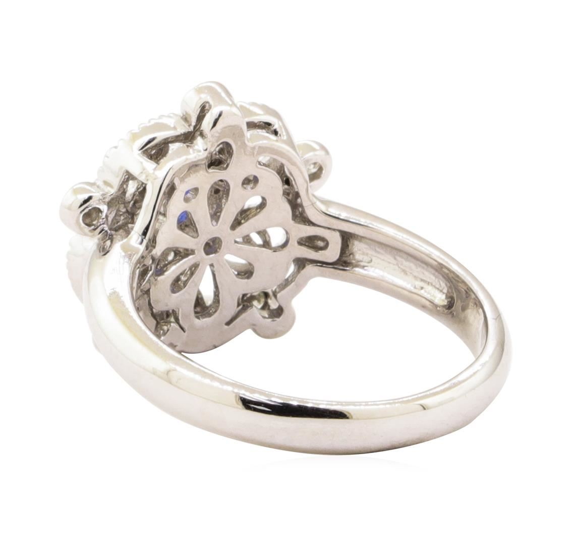 One electronically tested 14KT white gold lady's cast fashion ring with a floral halo motif with a bright polish with milgrain detailing finish. The featured lady's ring has a shank measuring 2.80 millimeters wide. Identified with markings of '14K'. Condi