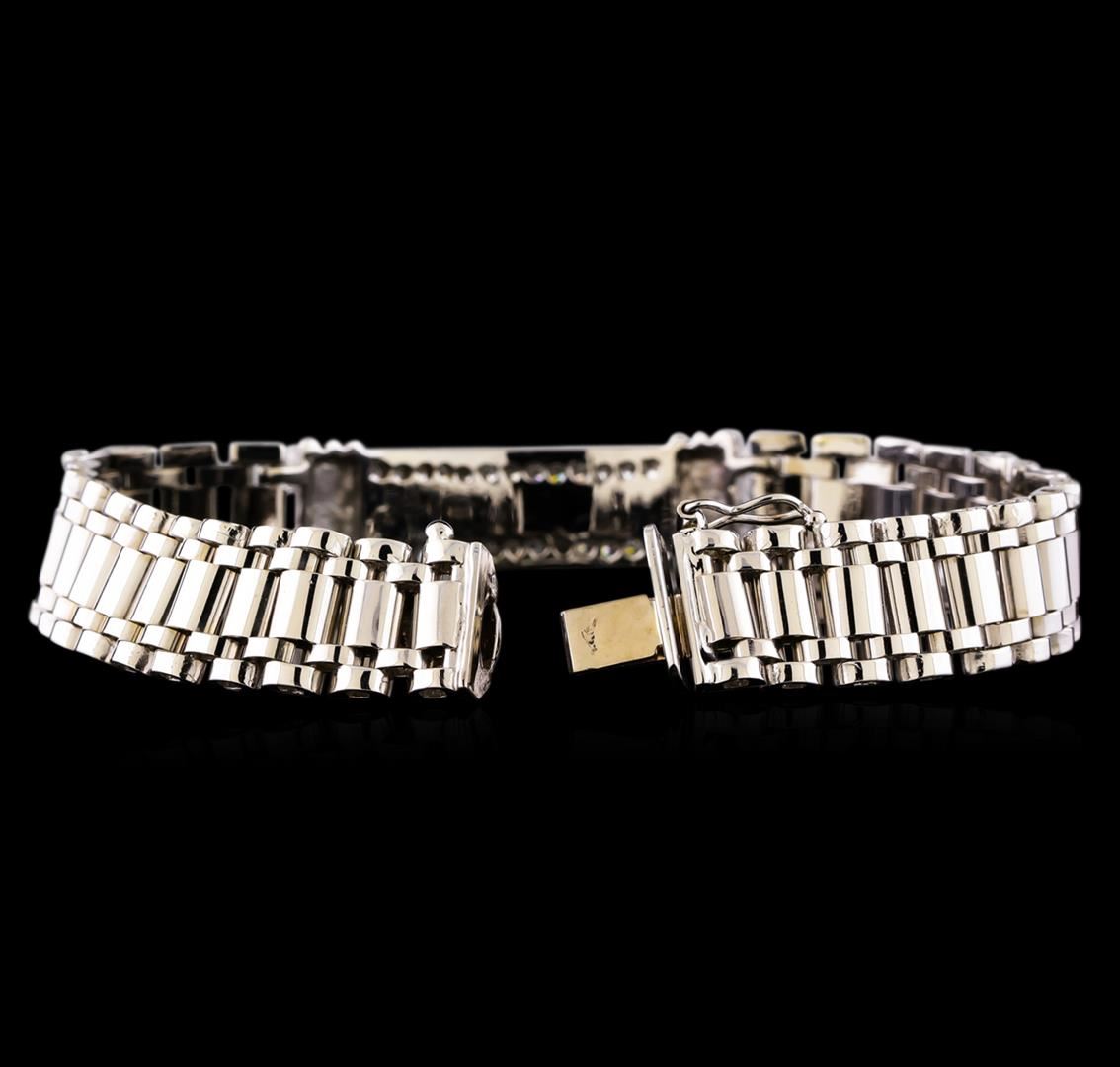 One electronically tested 14KT white gold man's combination cast & assembled fashion bracelet with a tongue clasp with foldover safety with a bright polish finish. The featured man's bracelet has an inlaid rectangular cut onyx measuring 28mm wide by 3mm thick, a watch band link motif and measures 8 inches in length. Identified with markings of '14K'. Condition is new, good workmanship. Containing: Twenty-Six channel set round brilliant cut diamonds, measuring 2.10 - 2.05 x 1.29mm (depth est.) approximate total weight of 26 Stones = 0.88ct. Graded in the setting. Clarity SI-1 to SI-2. Color: H - I Cut Good. Total Weight of Diamonds 0.88ct.. Total Weight of Bracelet 41.90gm. GAS Appraised at $9,495.00.