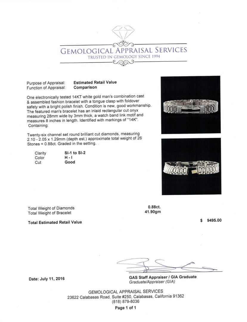 One electronically tested 14KT white gold man's combination cast & assembled fashion bracelet with a tongue clasp with foldover safety with a bright polish finish. The featured man's bracelet has an inlaid rectangular cut onyx measuring 28mm wide by 3mm thick, a watch band link motif and measures 8 inches in length. Identified with markings of '14K'. Condition is new, good workmanship. Containing: Twenty-Six channel set round brilliant cut diamonds, measuring 2.10 - 2.05 x 1.29mm (depth est.) approximate total weight of 26 Stones = 0.88ct. Graded in the setting. Clarity SI-1 to SI-2. Color: H - I Cut Good. Total Weight of Diamonds 0.88ct.. Total Weight of Bracelet 41.90gm. GAS Appraised at $9,495.00.