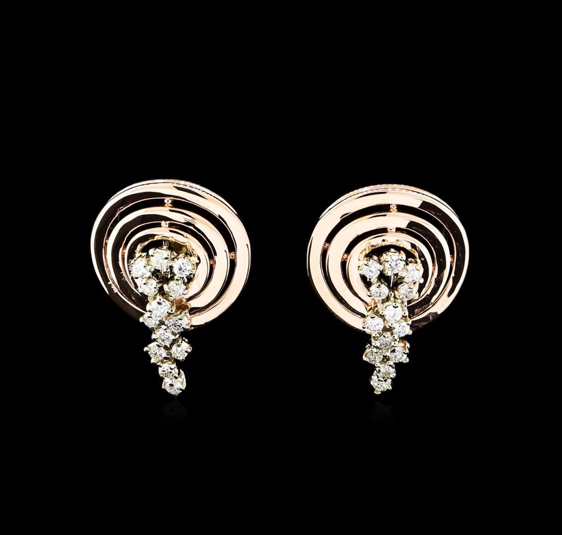 One pair electronically tested 14KT rose and white gold lady's combination cast & assembled fashion earrings with Omega clip backs with posts with a bright polish finish. Identified with markings of "585". Condition is new, good workmanship. Containing: Twenty-Six prong set round brilliant cut diamonds, measuring 2.20 - 2.00 x 1.26mm (depth est.) approximate total weight of 26 Stones = 0.88ct. Graded in the setting. Clarity: SI-1 to SI-2. Color: H - I. Cut Good. Total Weight of Diamonds 0.88ct. Total Weight of Earrings 12.00gm. GAS Appraised at $4,245.00.