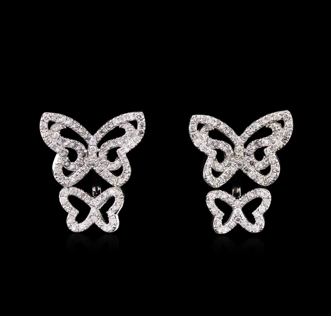 One pair electronically tested 14KT white gold lady's cast butterfly shape earrings with earring jackets with friction posts with a bright polish finish. Identified with markings of "K14". Condition is new, good workmanship. Containing: One Hundred Seventy-Eight prong set round brilliant cut diamonds, measuring 1.10 - 1.05 x 0.70mm (depth est.) approximate total weight of 178 Stones = 0.88ct. Graded in the setting. Clarity: SI-1 to I-1 . Color: G - I. Cut Good. Total Weight of Diamonds 0.88ct.. Total Weight of Earrings With Earring Jackets 6.30gm at $ 4270.00 GAS Appraised.