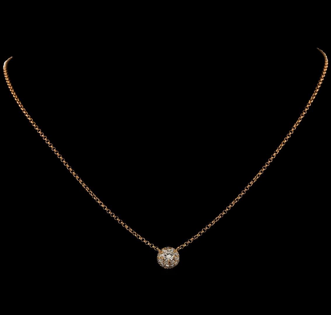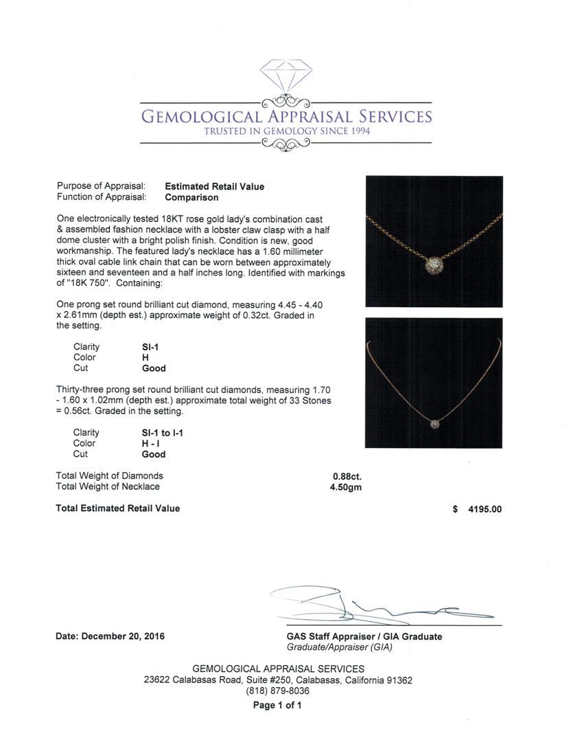 One electronically tested 18KT rose gold lady's combination cast & assembled fashion necklace with a lobster claw clasp with a half dome cluster with a bright polish finish. The featured lady's necklace has a 1.60 millimeter thick oval cable link chain that can be worn between approximately sixteen and seventeen and a half inches long. Identified with markings of '18K 750'. Condition is new, good workmanship. Containing: One prong set round brilliant cut diamond, measuring 4.45 - 4.40 x 2.61mm (depth est.) approximate weight of 0.32ct. Graded in the setting. Clarity SI-1. Color: H Cut Good Thirty-Three prong set round brilliant cut diamonds, measuring 1.70 - 1.60 x 1.02mm (depth est.) approximate total weight of 33 Stones = 0.56ct. Graded in the setting. Clarity SI-1 to I-1. Color: H - I Cut Good. Total Weight of Diamonds 0.88ct.. Total Weight of Necklace 4.50gm. GAS Appraised at $4,195.00.