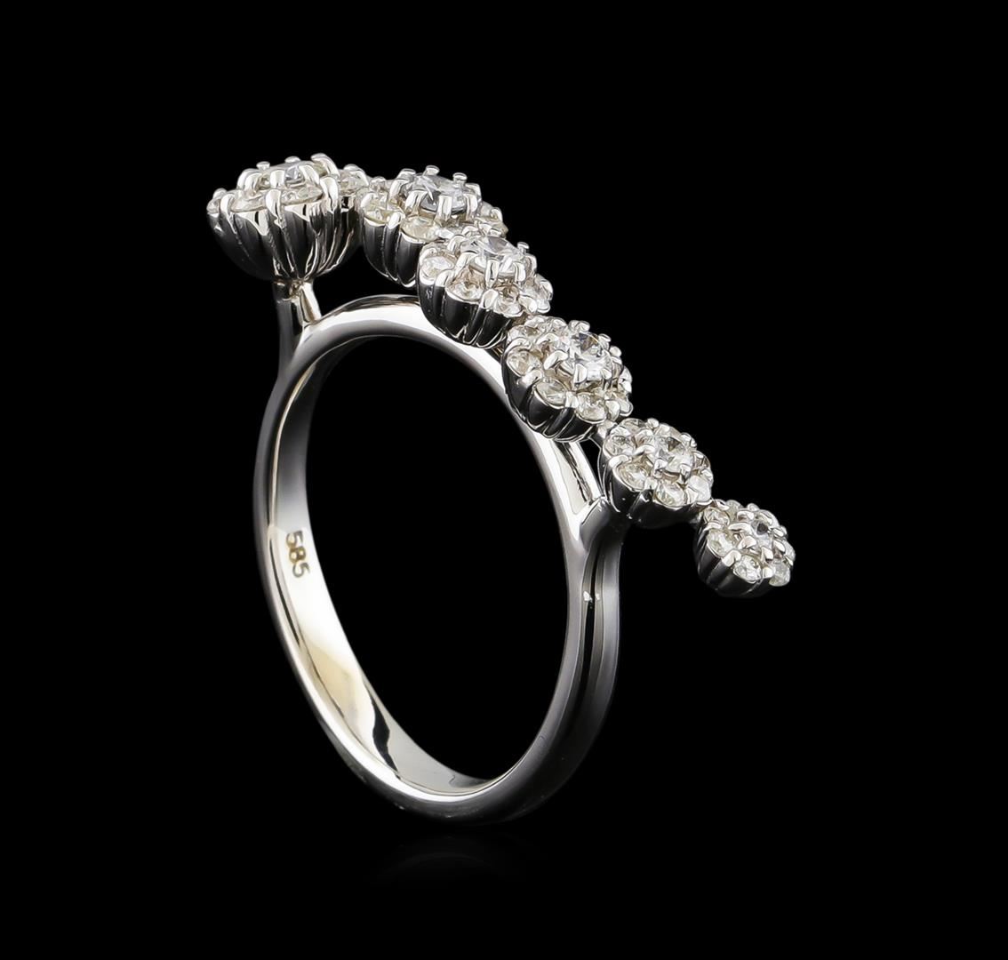 One electronically tested 14KT white gold lady's cast fashion ring with a bright polish finish. The featured lady's ring has a shank measuring 2.68 millimeters wide. Identified with markings of "585". Condition is new, good workmanship. Containing: One prong set round brilliant cut diamond, measuring 2.80 - 2.75 x 1.72mm (depth est.) approximate weight of 0.08ct. Graded in the setting. Clarity: SI-2. Color: I. Cut Very Good Three prong set round brilliant cut diamonds, measuring 2.70 - 2.65 x 1.66mm (depth est.) approximate total weight of 3 Stones = 0.22ct. Graded in the setting. Clarity: SI-1 to SI-2. Color: H - I. Cut Very Good Nine prong set round brilliant cut diamonds, measuring 1.90 - 1.80 x 1.15mm (depth est.) approximate total weight of 9 Stones = 0.22ct. Graded in the setting. Clarity: SI-1 to SI-2. Color: G - Good Thirty-Eight prong set round brilliant cut diamonds, measuring 1.40 - 1.30 x 0.84mm (depth est.) approximate total weight of 38 Stones = 0.36ct. Graded in the setting. Clarity: SI-1 to I-1. Color: G - Good. Total Weight of Diamonds 0.88ct. Total Weight of Ring 4.20gm. GAS Appraised at $3,040.00.