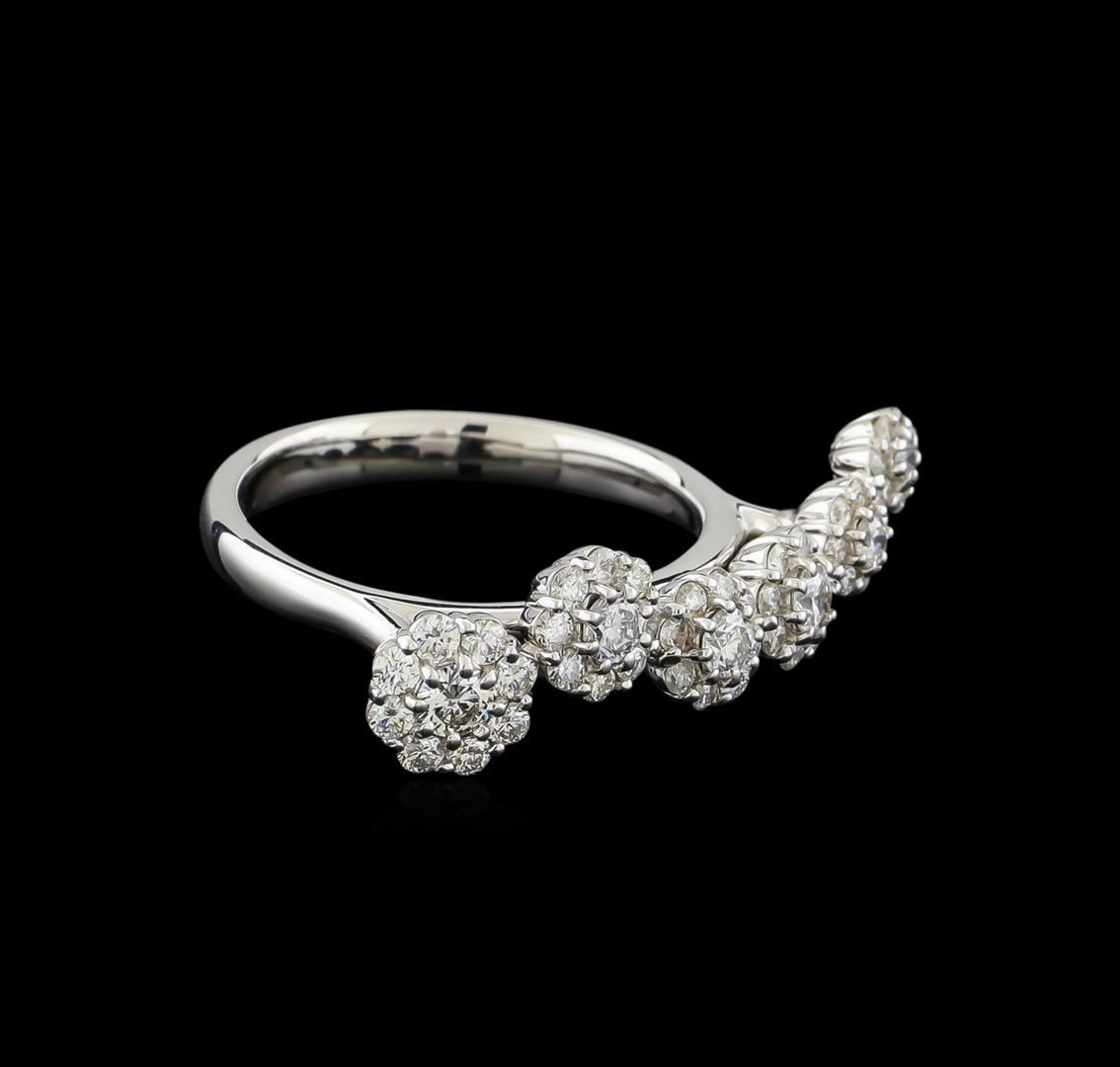One electronically tested 14KT white gold lady's cast fashion ring with a bright polish finish. The featured lady's ring has a shank measuring 2.68 millimeters wide. Identified with markings of "585". Condition is new, good workmanship. Containing: One prong set round brilliant cut diamond, measuring 2.80 - 2.75 x 1.72mm (depth est.) approximate weight of 0.08ct. Graded in the setting. Clarity: SI-2. Color: I. Cut Very Good Three prong set round brilliant cut diamonds, measuring 2.70 - 2.65 x 1.66mm (depth est.) approximate total weight of 3 Stones = 0.22ct. Graded in the setting. Clarity: SI-1 to SI-2. Color: H - I. Cut Very Good Nine prong set round brilliant cut diamonds, measuring 1.90 - 1.80 x 1.15mm (depth est.) approximate total weight of 9 Stones = 0.22ct. Graded in the setting. Clarity: SI-1 to SI-2. Color: G - Good Thirty-Eight prong set round brilliant cut diamonds, measuring 1.40 - 1.30 x 0.84mm (depth est.) approximate total weight of 38 Stones = 0.36ct. Graded in the setting. Clarity: SI-1 to I-1. Color: G - Good. Total Weight of Diamonds 0.88ct. Total Weight of Ring 4.20gm. GAS Appraised at $3,040.00.