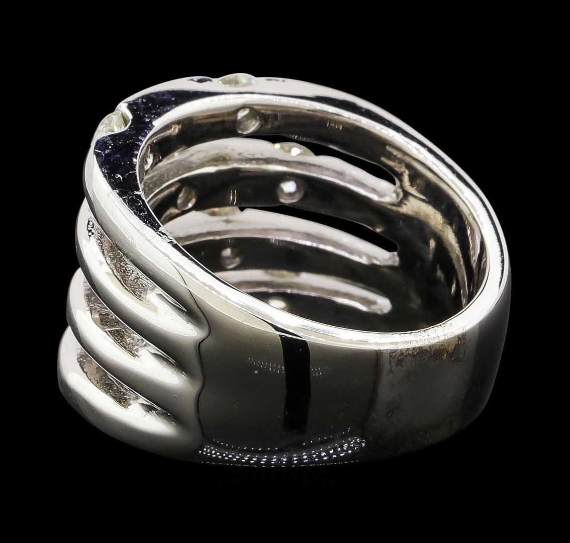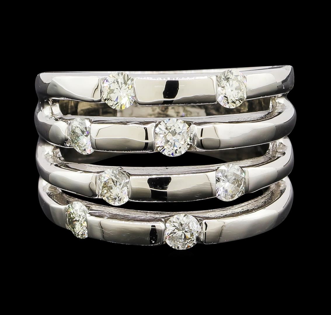 One electronically tested 14KT white gold lady's cast fashion ring with a four row split tapered shank with a bright polish finish. The featured lady's ring has a shank measuring 6.70 millimeters wide. Identified with markings of '14K'. Condition is new, good workmanship. Containing: Eight prong set round brilliant cut diamonds, measuring 3.10 - 3.05 x 1.91mm (depth est.) approximate total weight of 8 Stones = 0.88ct. Graded in the setting. Clarity SI-1 to I-1. Color: H - I Cut Good. Total Weight of Diamonds 0.88ct.. Total Weight of Ring 12.50gm. GAS Appraised at $3,825.00.