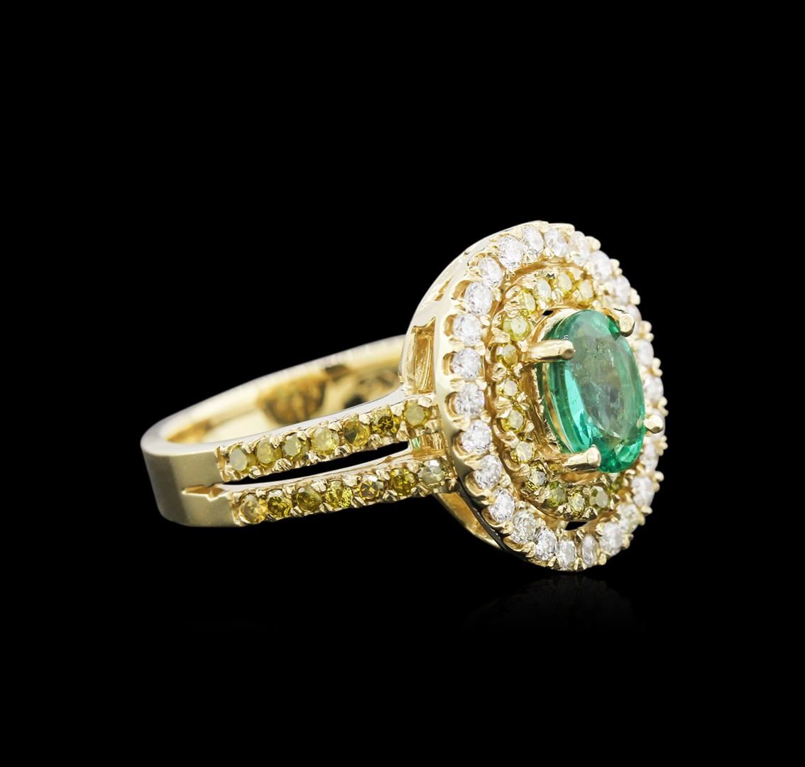 One ring featuring: 14KT yellow gold weighing 7.10 grams containing one emerald center stone with a total weight of 0.88ct and 74 white and yellow diamonds with a total weight of 0.90ct.