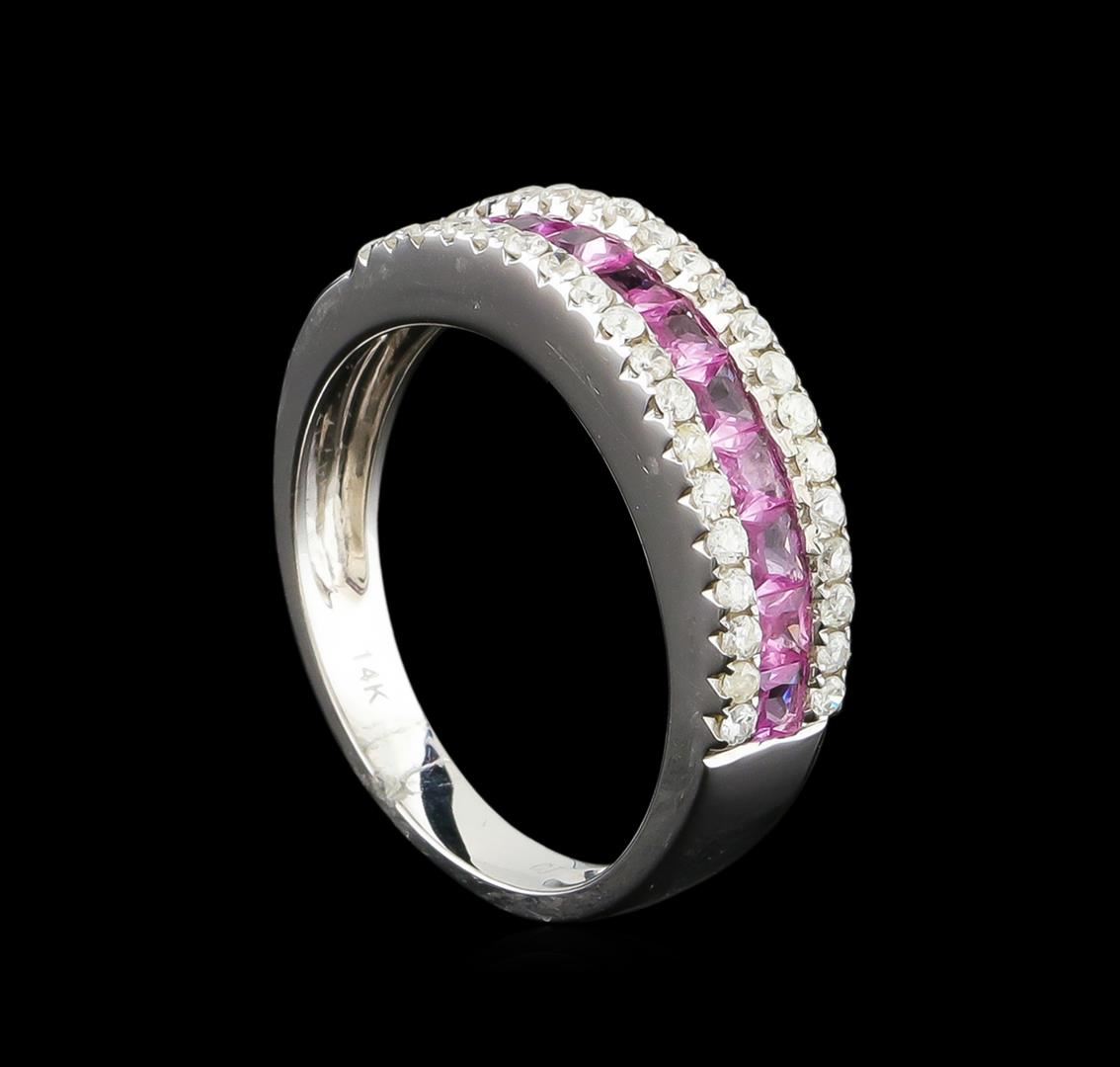 One electronically tested 14KT white gold ladies cast pink sapphire and diamond ring with a bright polish finish. The ring features a five millimeter wide pink sapphire and diamond ribbon supported by tapering shoulders, completed by a three millimeter wide band. Trademark is CJ. Identified with markings of "14K". Condition is new, good workmanship. Containing: Eleven channel set square mixed cut natural pink sapphires, measuring 2.40 x 2.30 x 1.53mm, approximate total weight of 0.88ct., clarity is eye clean, medium, very slightly grayish, pink color, (GIA Pk 5/3), cut is good. Transmitting light with no distortion, transparent. Measurements & the color grade are an average for the group. Graded in the setting. Thirty-Six prong set round brilliant cut diamonds, measuring 1.40 - 1.30 x 0.81mm (depth est.) approximate total weight of 36 Stones = 0.35ct. Graded in the setting. Clarity: I-1 to I-2. Color: G - I. Total Weight of Colored Stones 0.88ct. Total Weight of Diamonds 0.35ct. Total Weight of Ring 3.53gm. AIG Appraised at $1,740.00.
