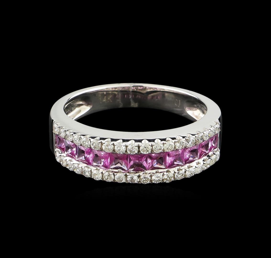 One electronically tested 14KT white gold ladies cast pink sapphire and diamond ring with a bright polish finish. The ring features a five millimeter wide pink sapphire and diamond ribbon supported by tapering shoulders, completed by a three millimeter wide band. Trademark is CJ. Identified with markings of "14K". Condition is new, good workmanship. Containing: Eleven channel set square mixed cut natural pink sapphires, measuring 2.40 x 2.30 x 1.53mm, approximate total weight of 0.88ct., clarity is eye clean, medium, very slightly grayish, pink color, (GIA Pk 5/3), cut is good. Transmitting light with no distortion, transparent. Measurements & the color grade are an average for the group. Graded in the setting. Thirty-Six prong set round brilliant cut diamonds, measuring 1.40 - 1.30 x 0.81mm (depth est.) approximate total weight of 36 Stones = 0.35ct. Graded in the setting. Clarity: I-1 to I-2. Color: G - I. Total Weight of Colored Stones 0.88ct. Total Weight of Diamonds 0.35ct. Total Weight of Ring 3.53gm. AIG Appraised at $1,740.00.